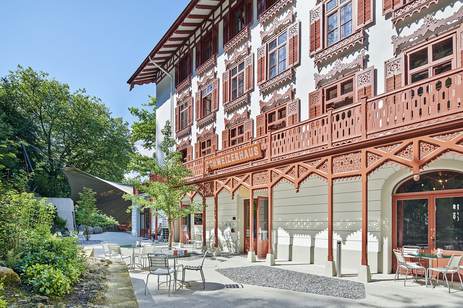 Parallel zu den Arbeiten an der neuen Attraktion wird das Schweizerhaus von seinen Anbauten befreit und sorgfältig saniert. Das unter Denkmalschutz stehende Gebäude von 1874 ist ein Vertreter der Laubsägeliarchitektur, ist im Chaletstil erbaut und und weist viele filigran gestaltete Holzverzierungen an der Fassade auf (vgl. Flyer Schweizerhaus - vorher 2019 - nachher 2022).