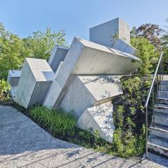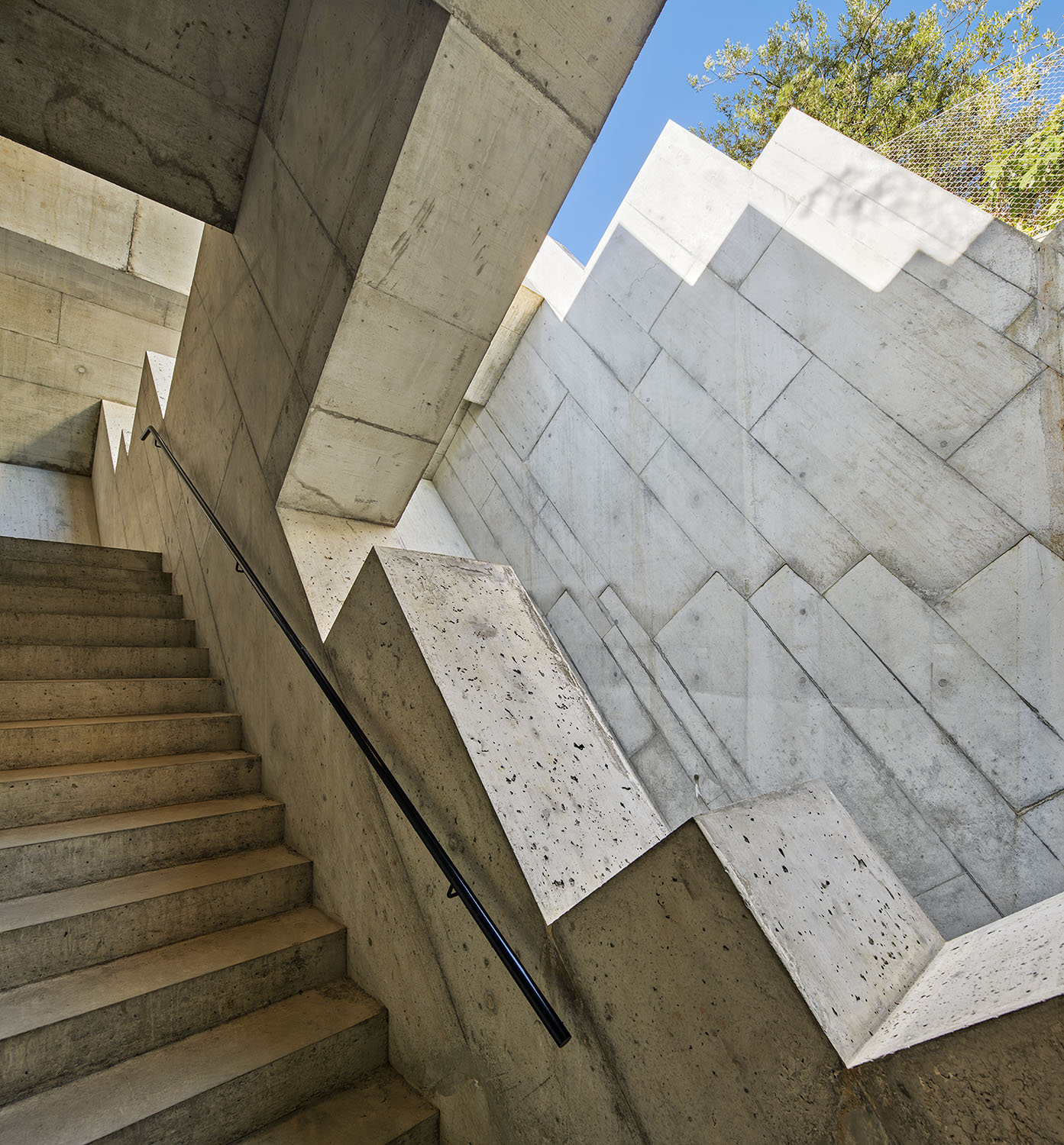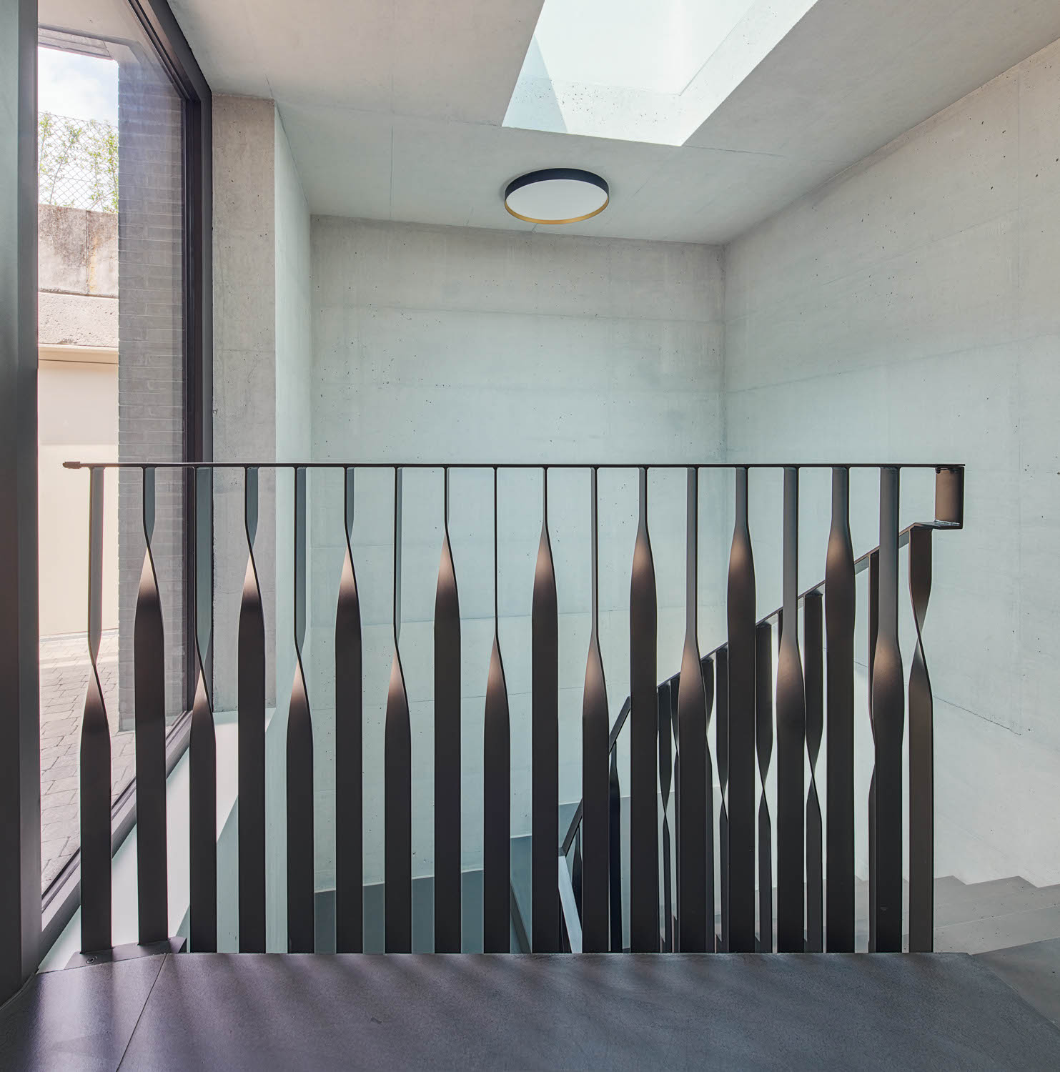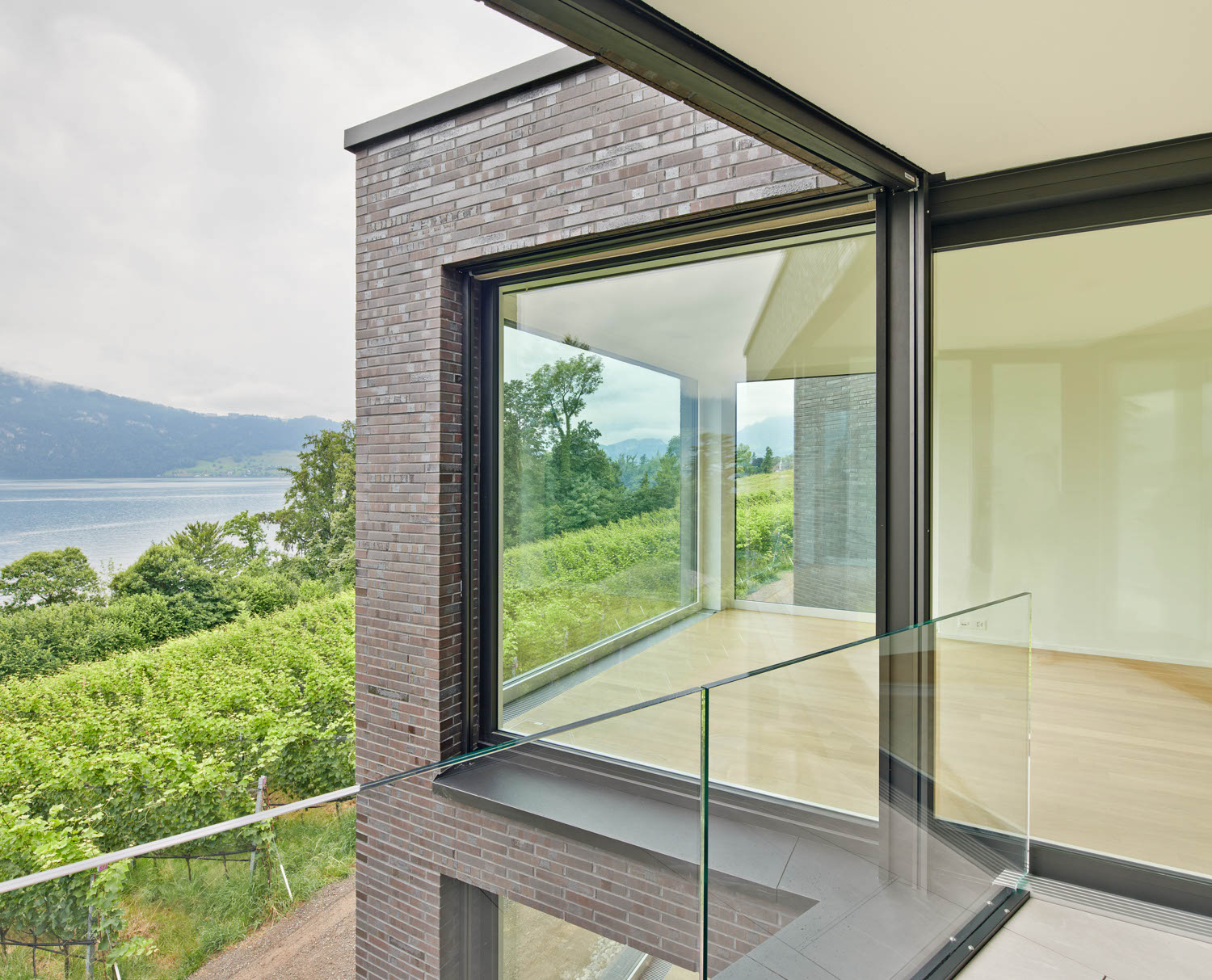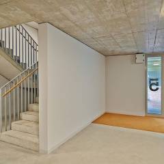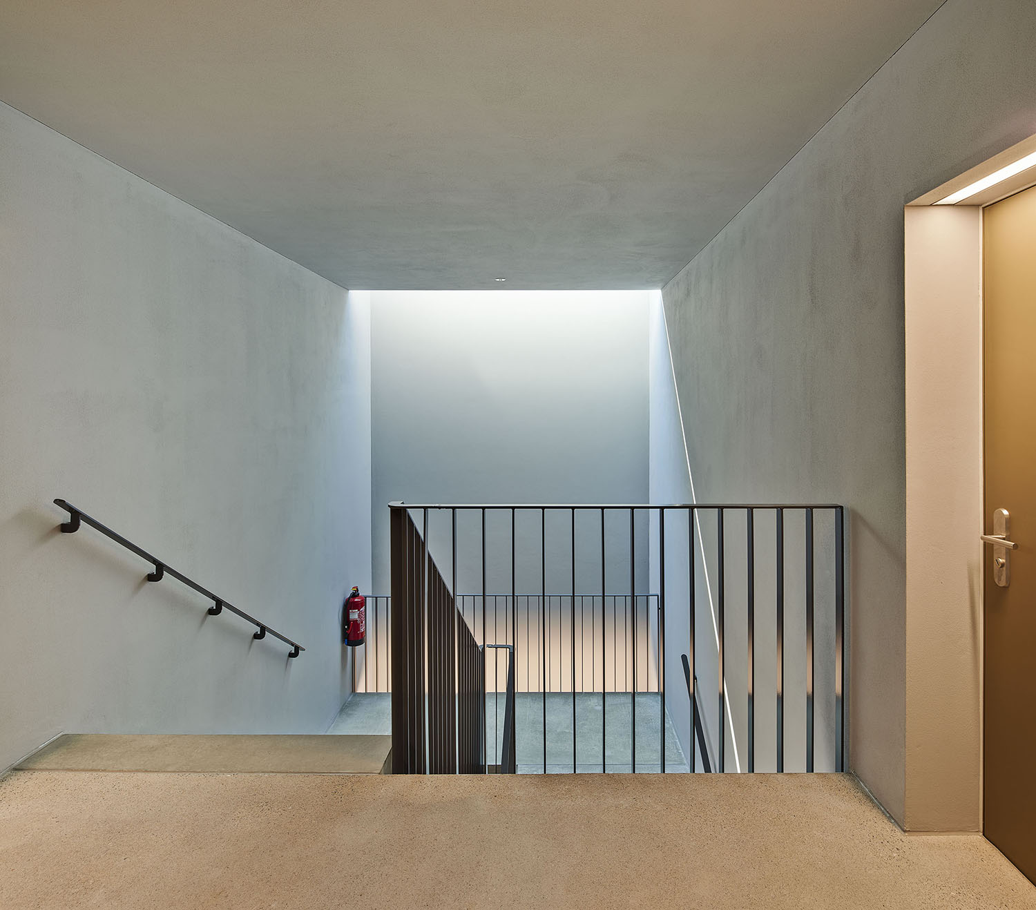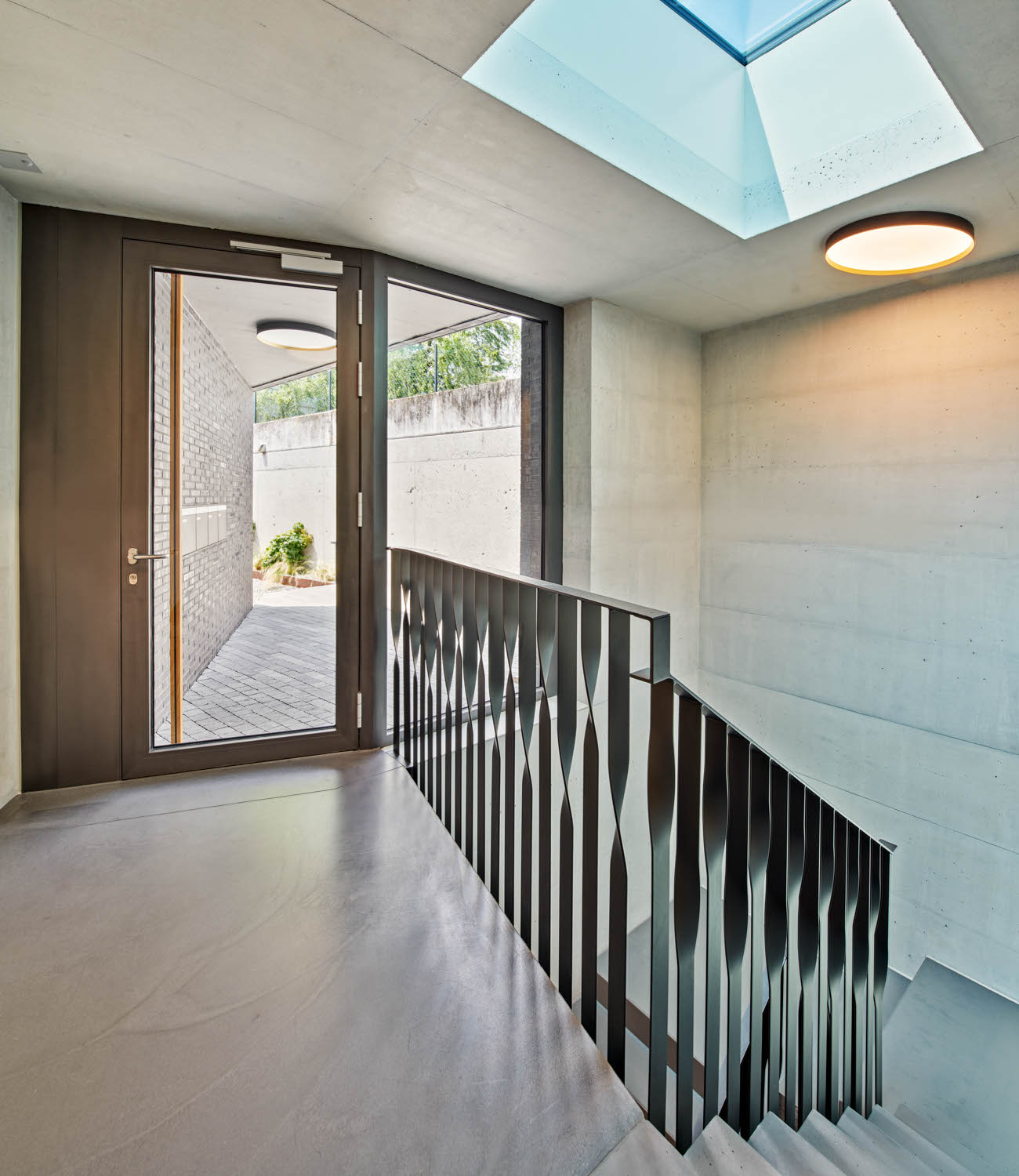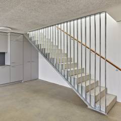 Der erfinderische Umgang mit der Erkerregel und die Anordnung der Geschosse als Splitlevel nützten das Grundstück maximal aus und verleihen dem Haus eine überraschende räumliche Grosszügigkeit und Vielfalt. In Bezugnahme zur steilen Topografie erlauben die splitlevel die optimale Einbettung ins Terrain mit terrassierten Aussenräumen auf allen Niveaus. Ein grosszügiges Treppenhaus mit kurzen Treppenläufen schafft einen selbstverständlichen räumlichen Zusammenhang.