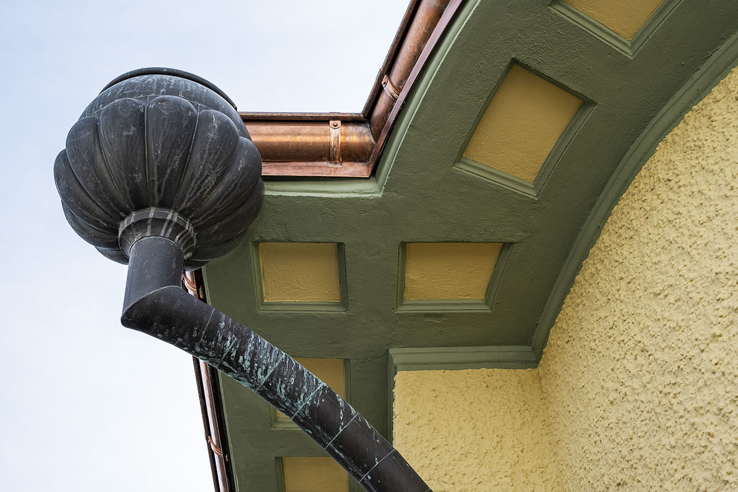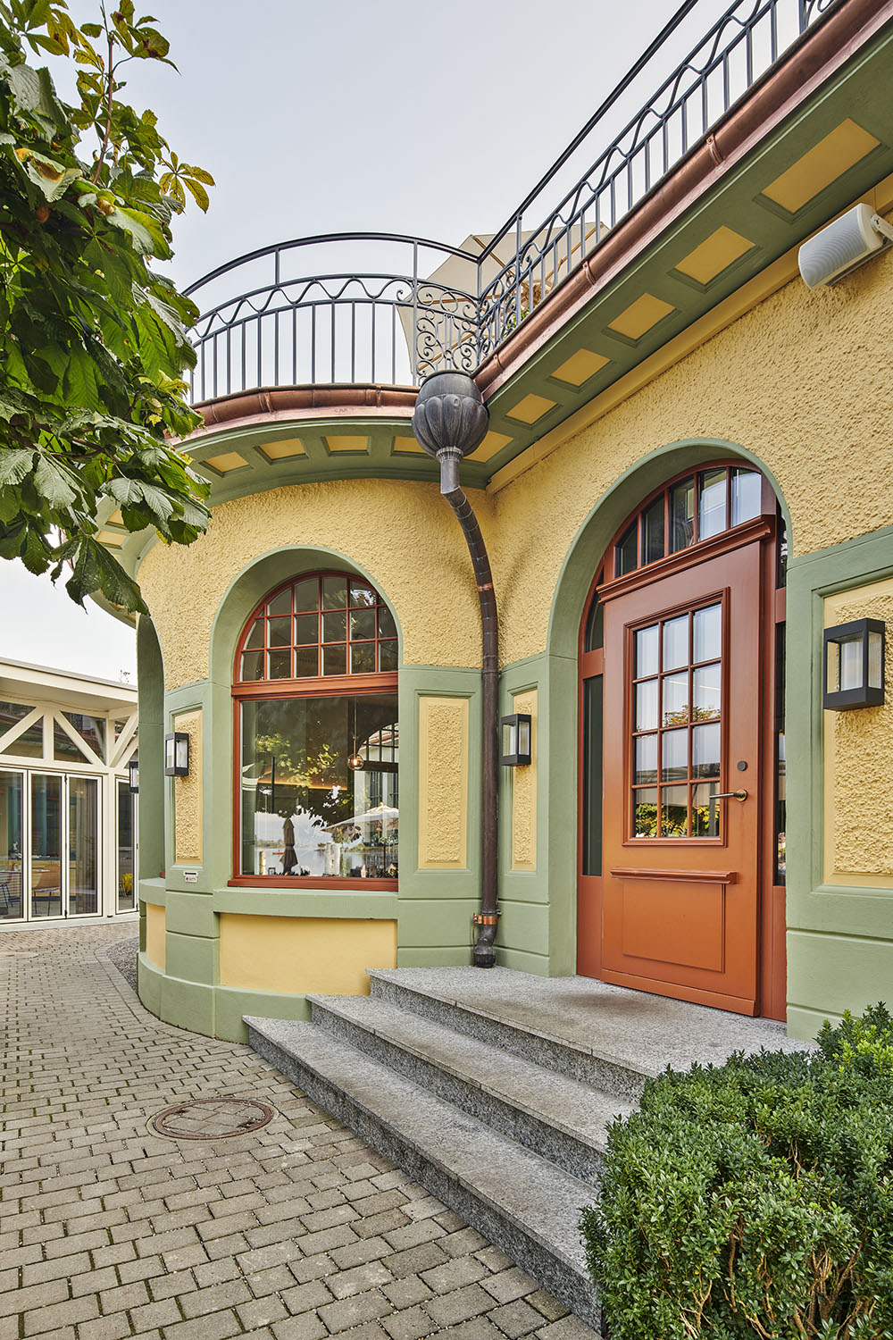 2020 wurde das Gebäude saniert und restauriert. Aussen galt das Motto: «Instandsetzung». Im Innern zeigte der Zustand vor der Sanierung beinahe einen Rohbau. Es konnten einige Bauteile repariert (z.B. Parkett im Erdgeschoss), andere erhalten (z.B. die Treppe) und einige Bauteile mussten handwerklich rekonstruiert werden (z.B. Treppengeländer). Alle neuen Bauteile sind systemgerecht und gestalterisch geschickt gewählt worden. So passt zum Beispiel der ausgewählte Terrazzo sehr gut in die typische Materialwahl des frühen 20. Jahrhunderts und setzt Bezüge zum steinigen Äusseren. Die Farben im Innern tragen entscheidend zu einer authentischen Raumstimmung bei. Es handelt sich um fein abgestimmte Kalkfarben in den Haupträumen in warmen Grautönen mit hellen Stuckarbeiten und dunkelgrüngrauen Farbtönen im Bad.