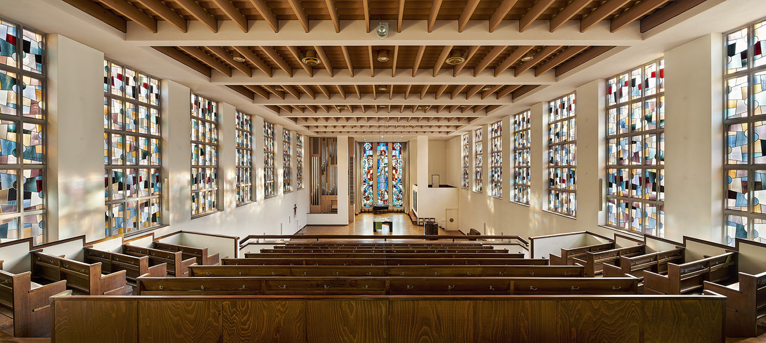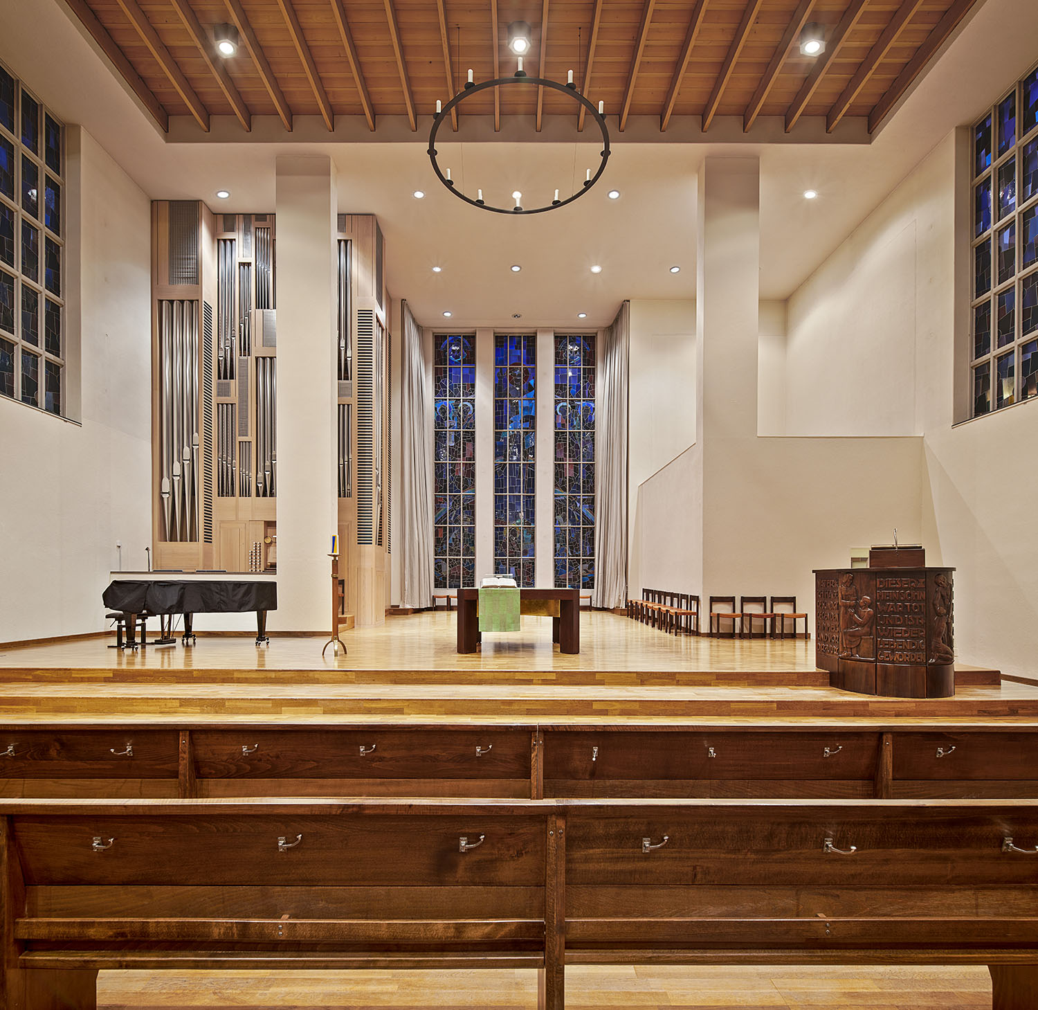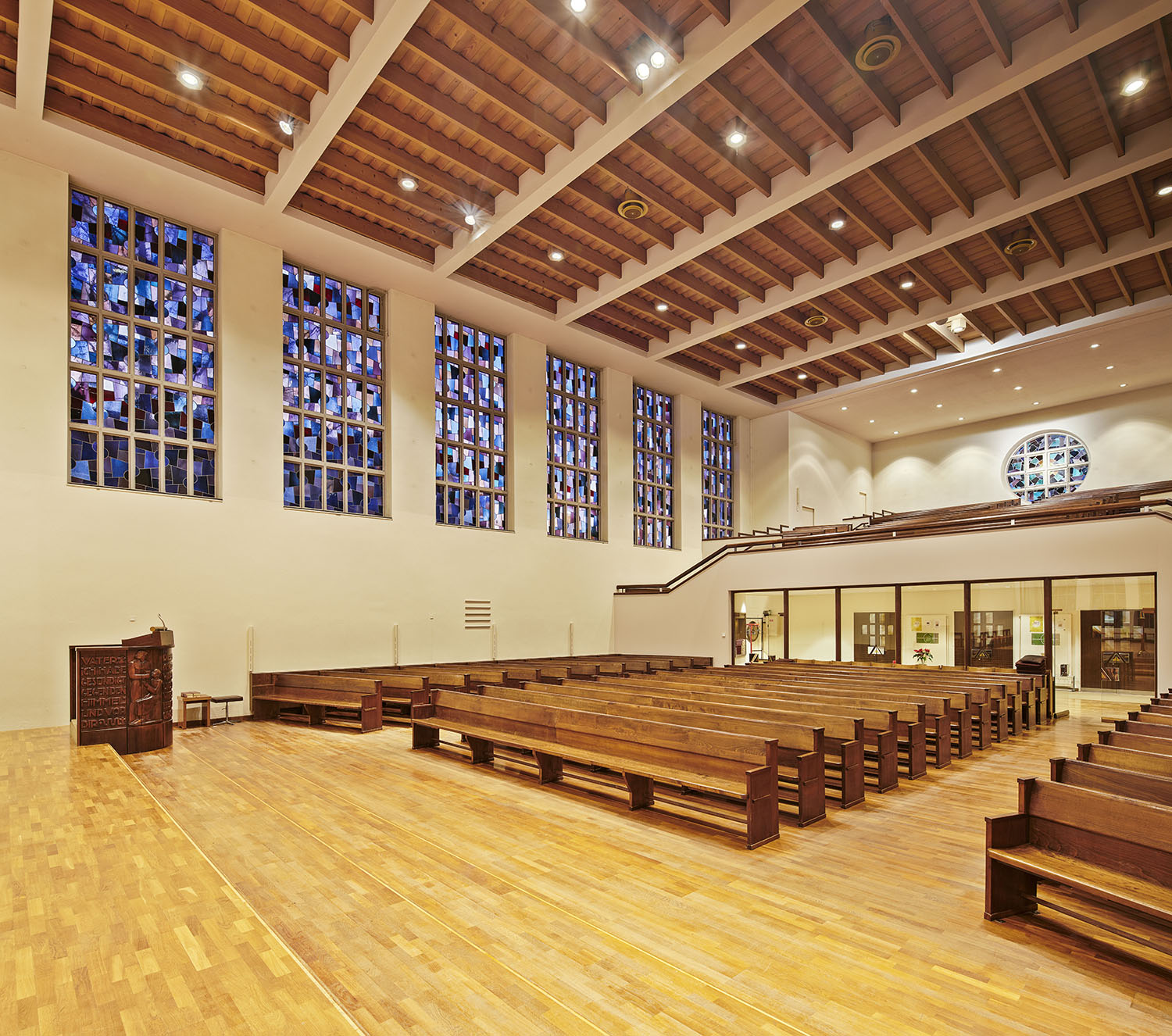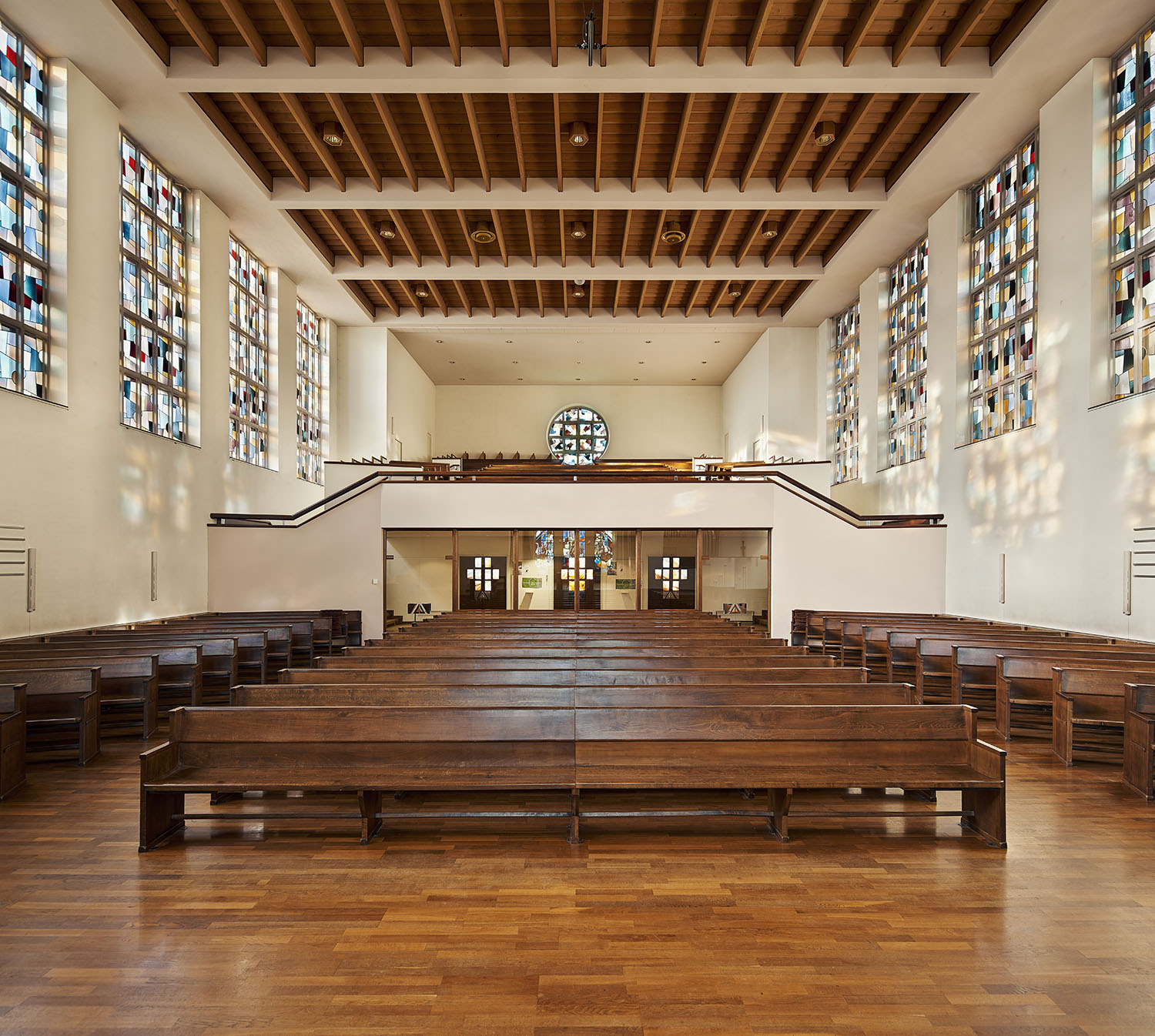 Der Kirchenraum ist eine längsgerichtete Saalkirche mit Empore und Chor. Durch die Reduktion von Material, Oberflächen und Ausstattung wirkt die Kirche schlicht. Die hochrechteckigen, direkt unter der Decke angesetzten Glasfenstern tauchen den Saal je nach Tageszeit und Witterung in verschiedene Stimmungen. Die drei schmalen, hohen Chorfenster leiten den Blick nach vorne zum Abendmahltisch, dem liturgischen Zentrum des Raums. Alle Glasfenster wurden von Louis Moilliet entworfen – ein Aquarellist und Glaskünstler, der u.a. Kontakte zum Blauen Reiter hatte.1980/81 wurde die Kirche vom Architekt Ivo Musar umgebaut. Dabei wurde der Chorbereich und die Empore vergrössert und ein Foyer, als grosszügige Begegnungszone, unter der Empore eingebaut. Auch wurden die Bänke neu ausgerichtet mit zwei Seitengängen.