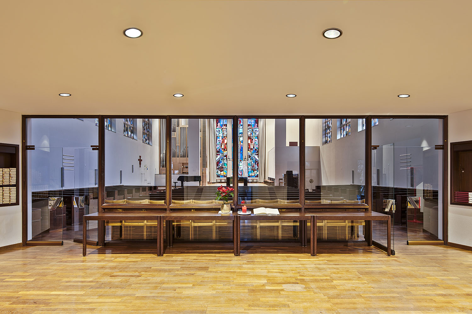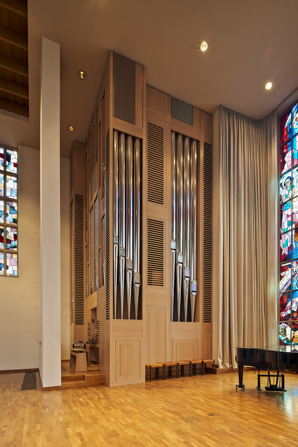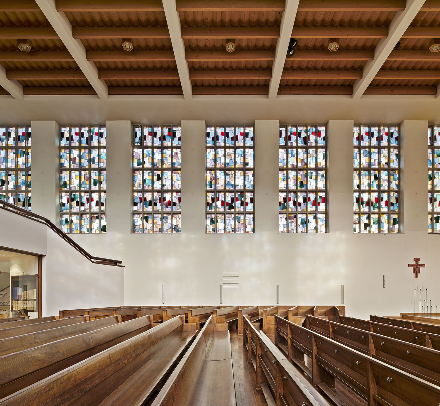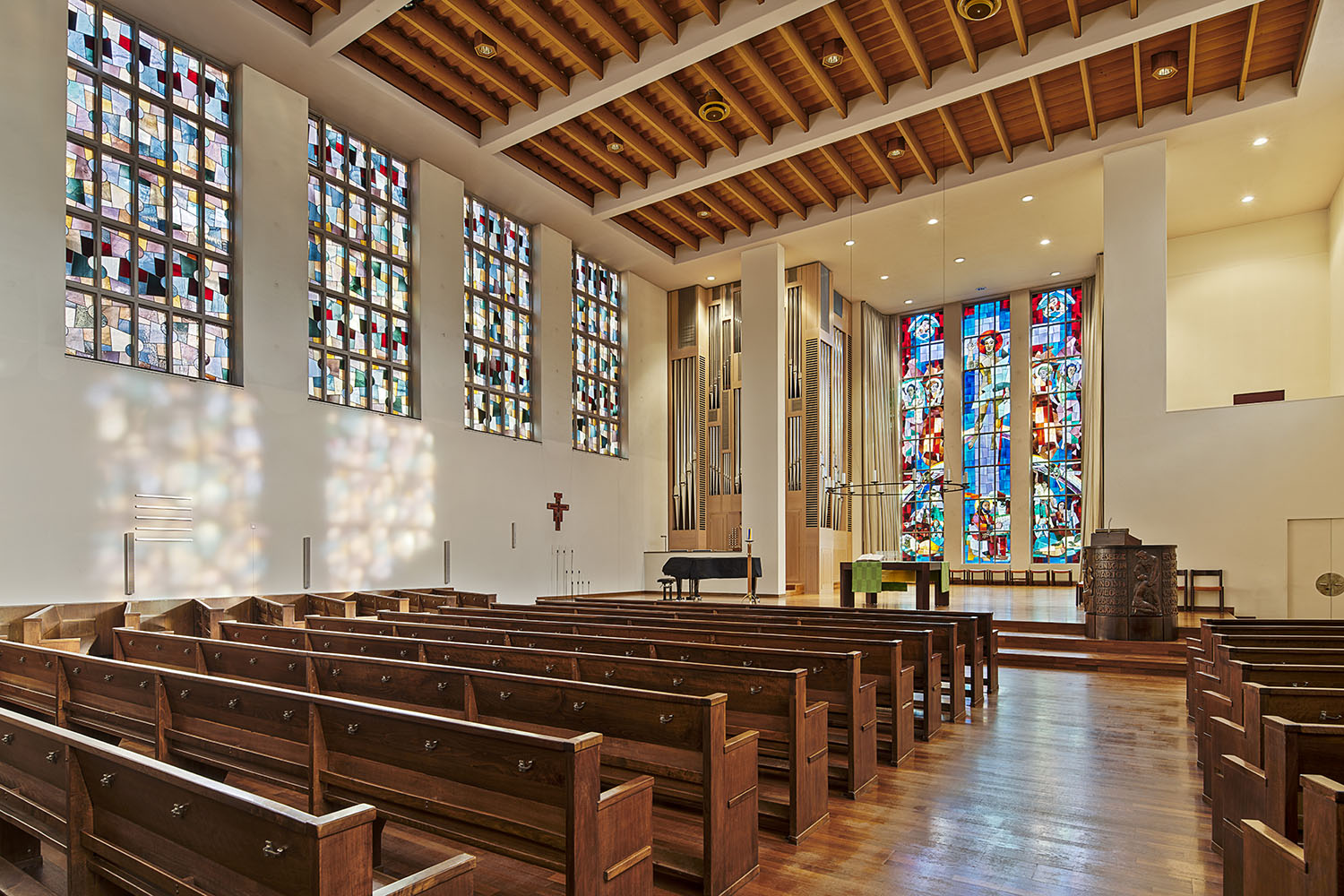 Der Kirchenraum ist eine längsgerichtete Saalkirche mit Empore und Chor. Durch die Reduktion von Material, Oberflächen und Ausstattung wirkt die Kirche schlicht. Die hochrechteckigen, direkt unter der Decke angesetzten Glasfenstern tauchen den Saal je nach Tageszeit und Witterung in verschiedene Stimmungen. Die drei schmalen, hohen Chorfenster leiten den Blick nach vorne zum Abendmahltisch, dem liturgischen Zentrum des Raums. Alle Glasfenster wurden von Louis Moilliet entworfen – ein Aquarellist und Glaskünstler, der u.a. Kontakte zum Blauen Reiter hatte.1980/81 wurde die Kirche vom Architekt Ivo Musar umgebaut. Dabei wurde der Chorbereich und die Empore vergrössert und ein Foyer, als grosszügige Begegnungszone, unter der Empore eingebaut. Auch wurden die Bänke neu ausgerichtet mit zwei Seitengängen.