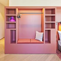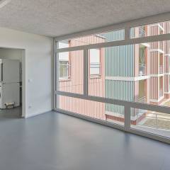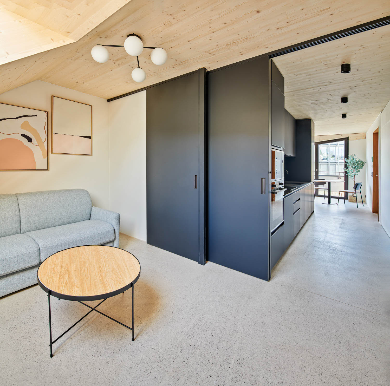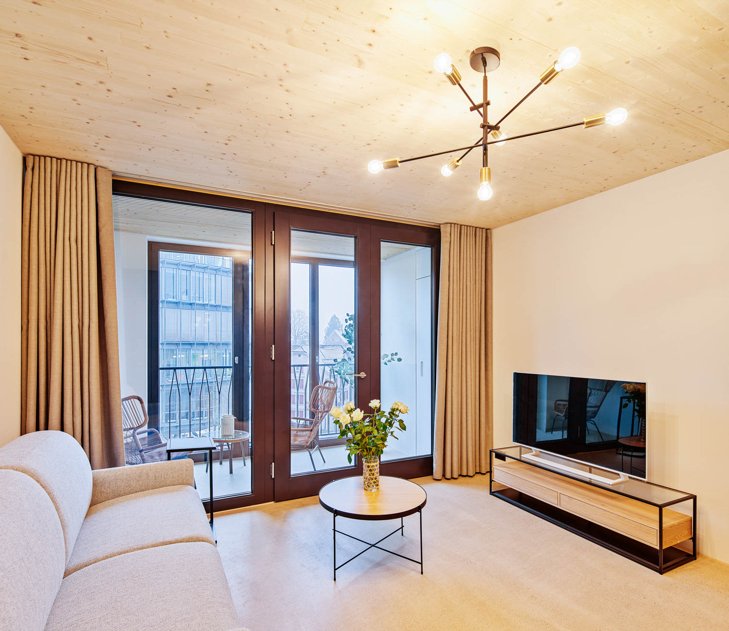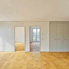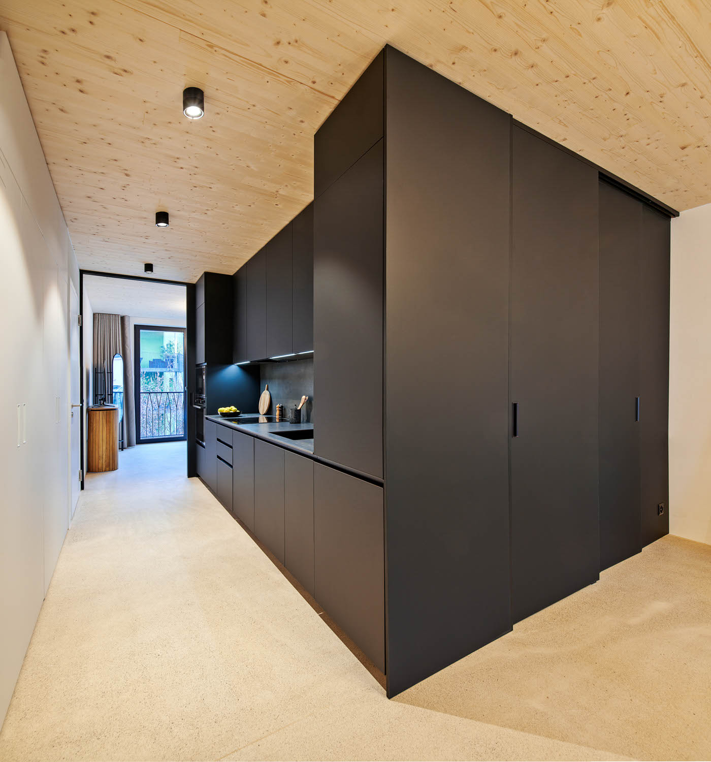 Auf der 1. bis zur 6. Etage sind 15 Wohnungen à 2,5 Zimmer verteilt. Alle Wohnungen verfügen über einen abgetrennten Wohn- Essbereich und einem Schlafzimmer dahinter. Die raumtrennenden Schrankfronten bieten Stauraum und zugleich Privatsphäre.