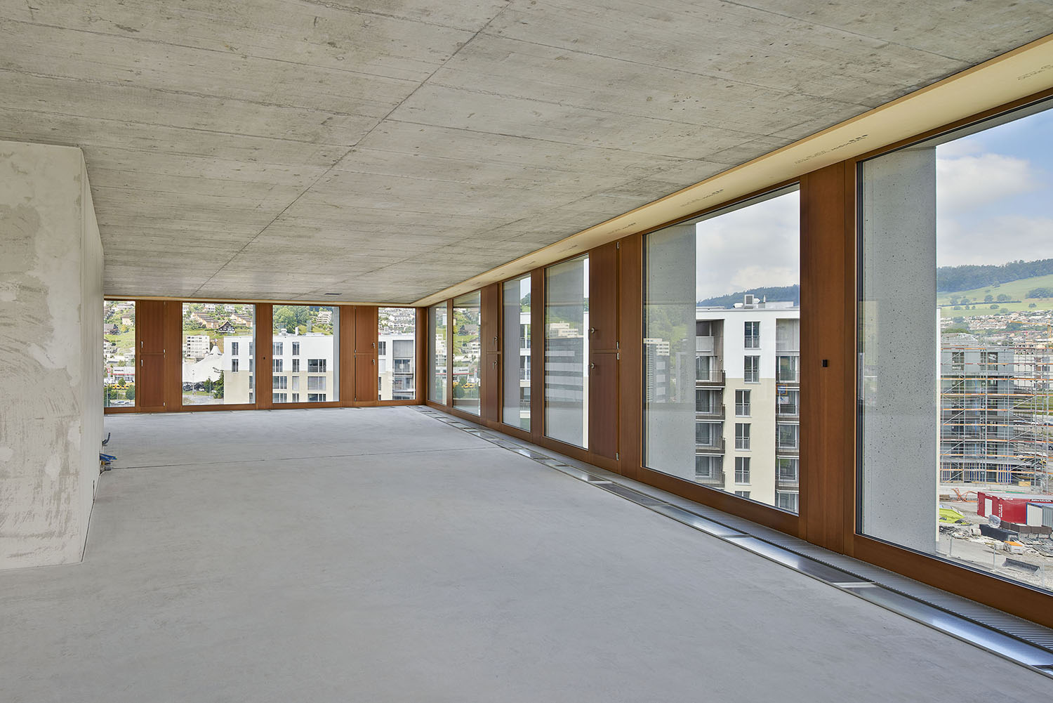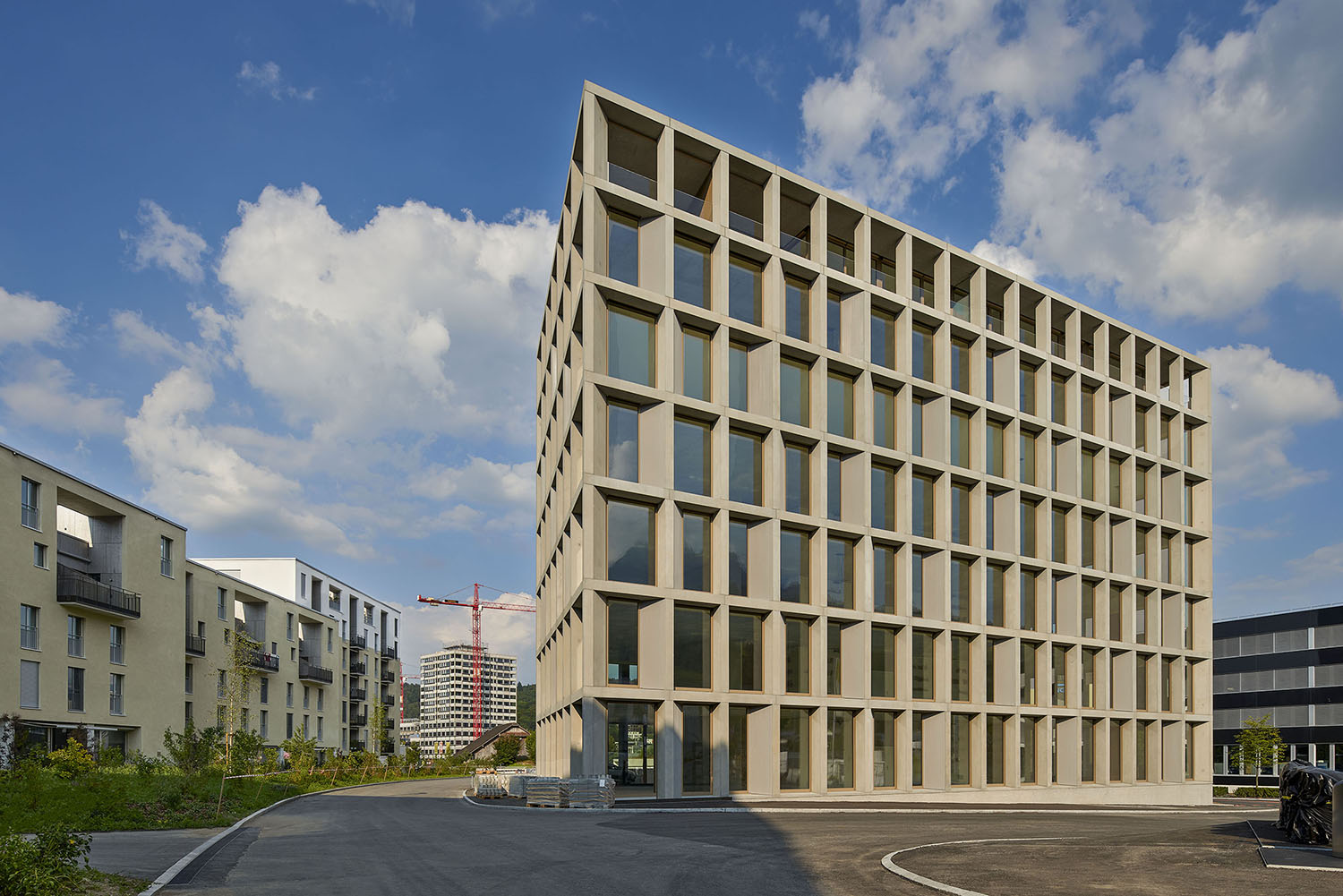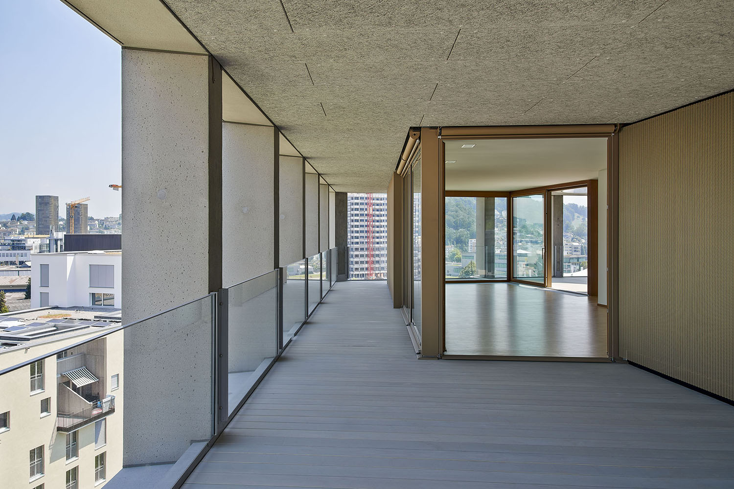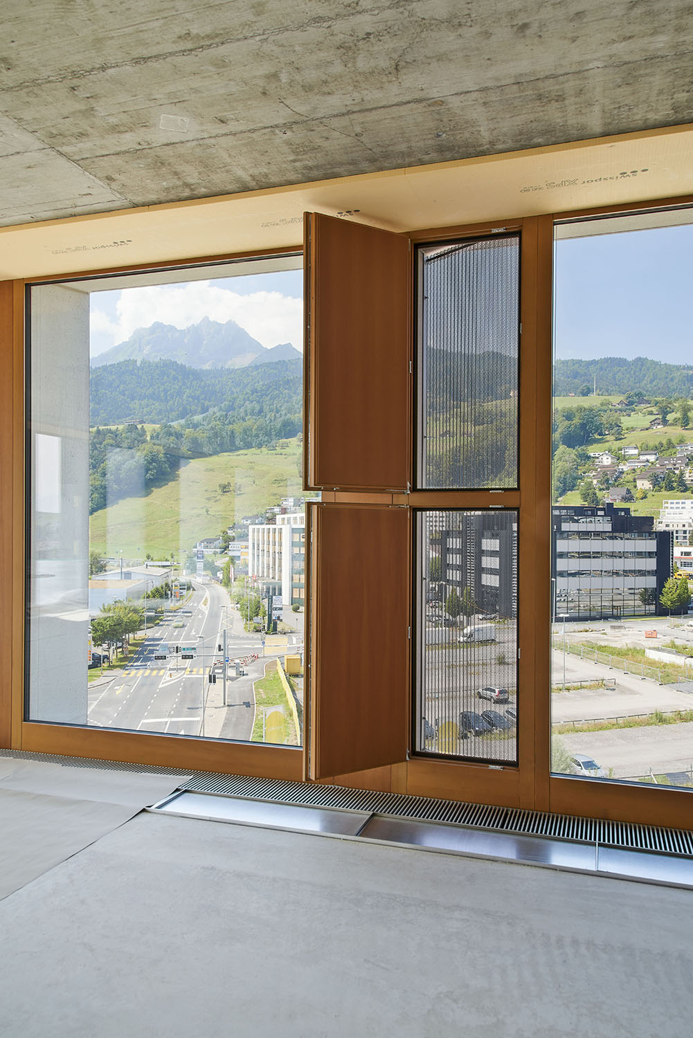 Im höchsten Holzhochhaus der Schweiz mit 60 m Höhe belegt die Hochschule Luzern neun Etagen und das zweite Gebäude nutzt sie alleine. Die beiden Gebäude sind über vier Geschosse miteinander verbunden.