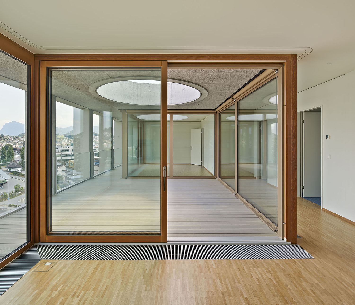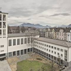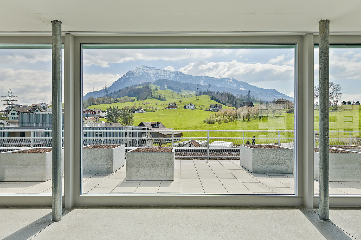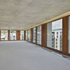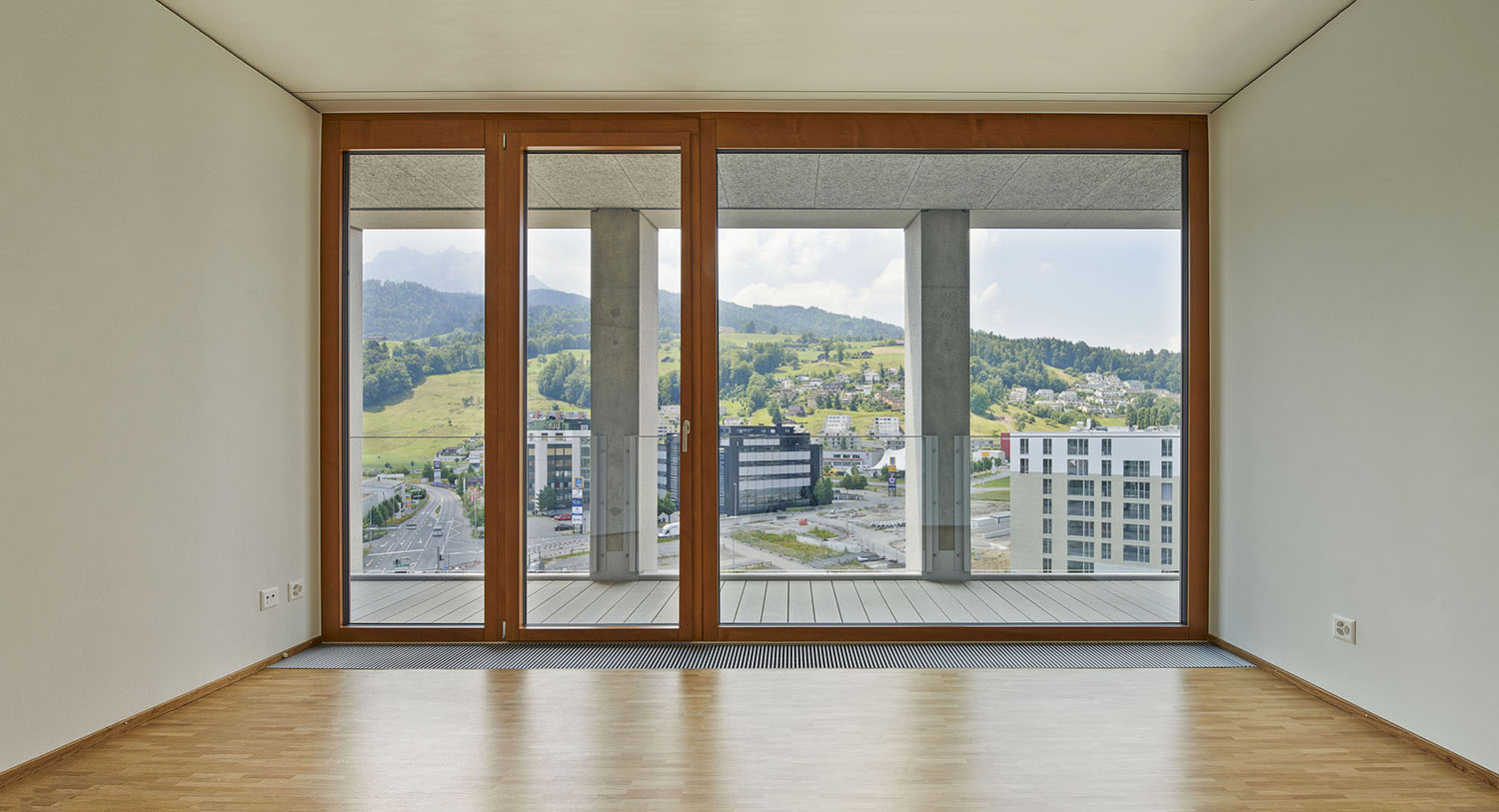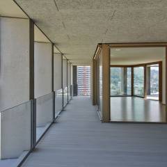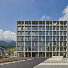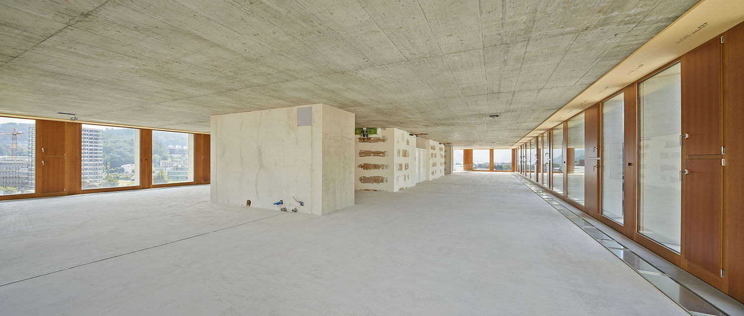 Im höchsten Holzhochhaus der Schweiz mit 60 m Höhe belegt die Hochschule Luzern neun Etagen und das zweite Gebäude nutzt sie alleine. Die beiden Gebäude sind über vier Geschosse miteinander verbunden.