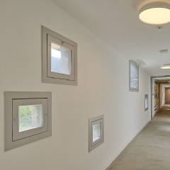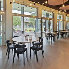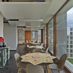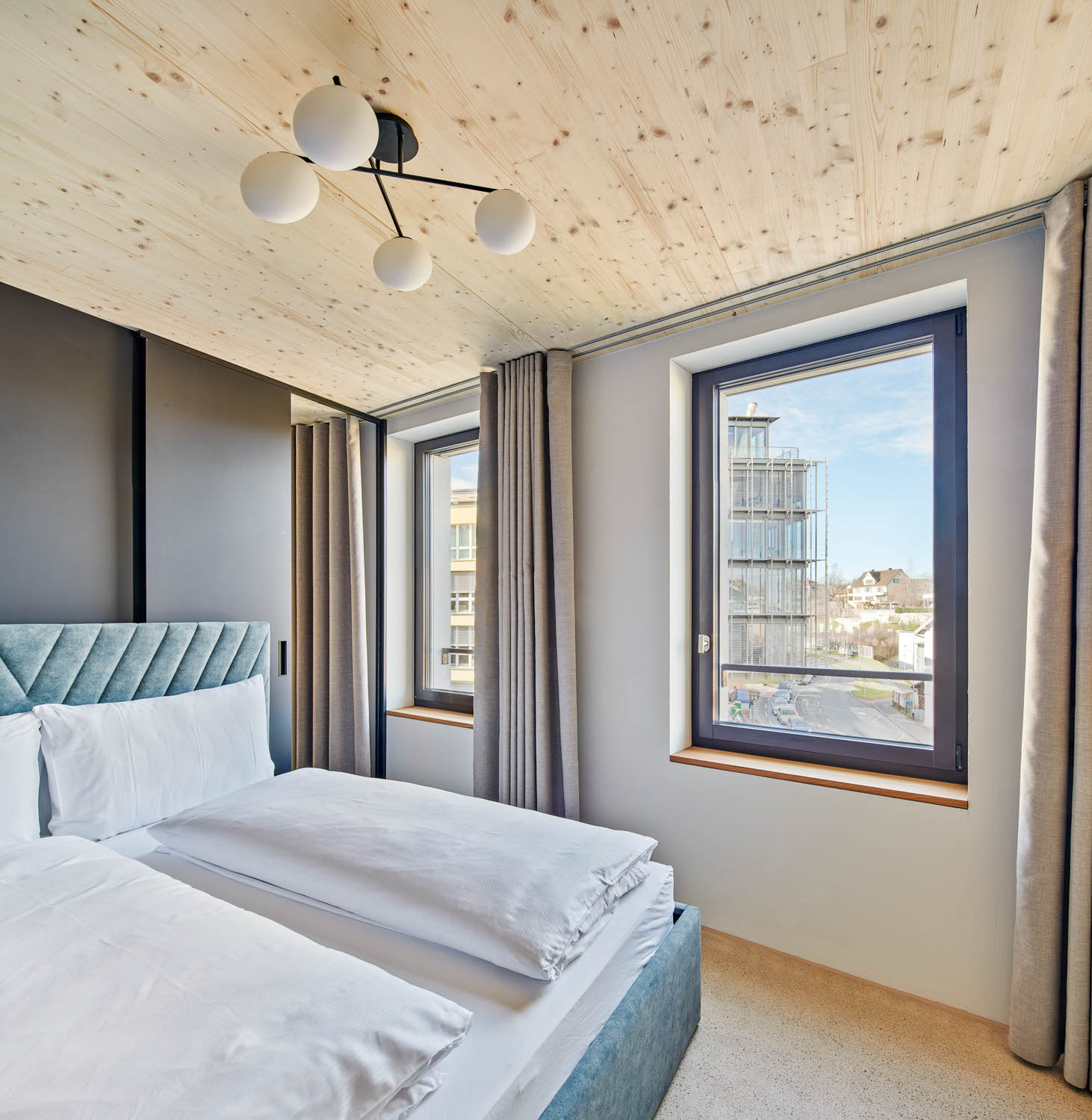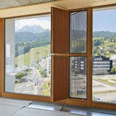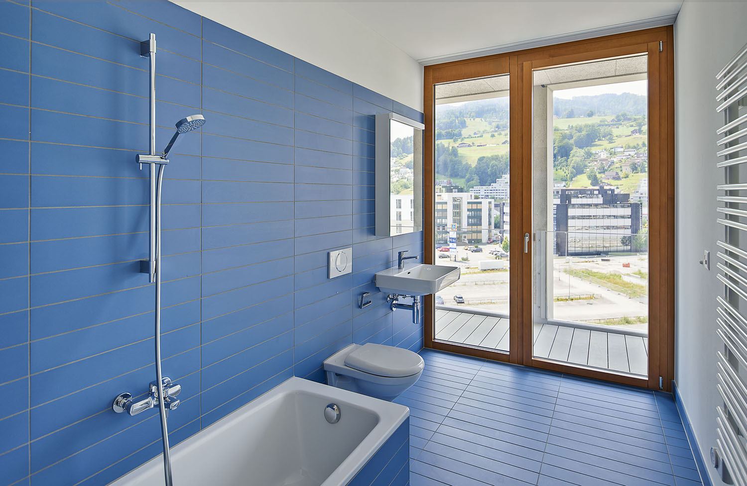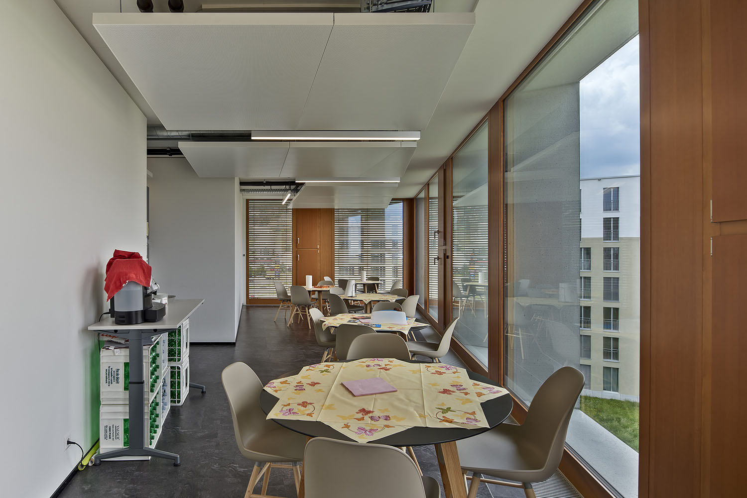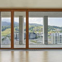 Im höchsten Holzhochhaus der Schweiz mit 60 m Höhe belegt die Hochschule Luzern neun Etagen und das zweite Gebäude nutzt sie alleine. Die beiden Gebäude sind über vier Geschosse miteinander verbunden.