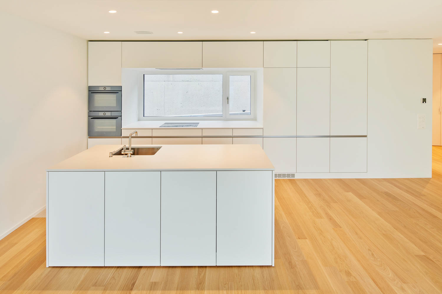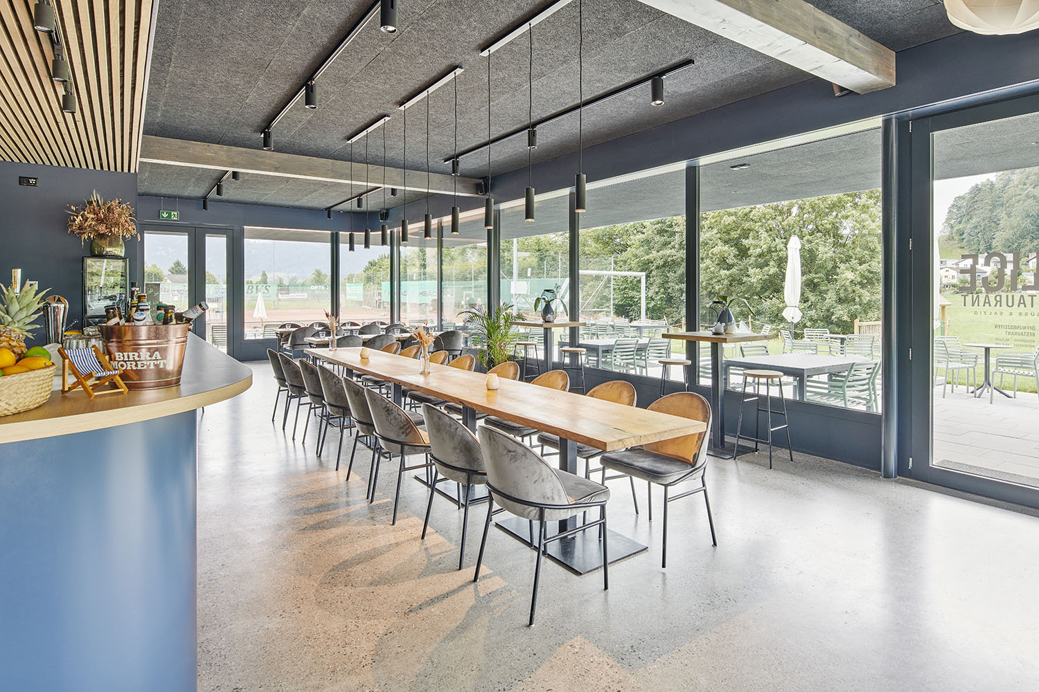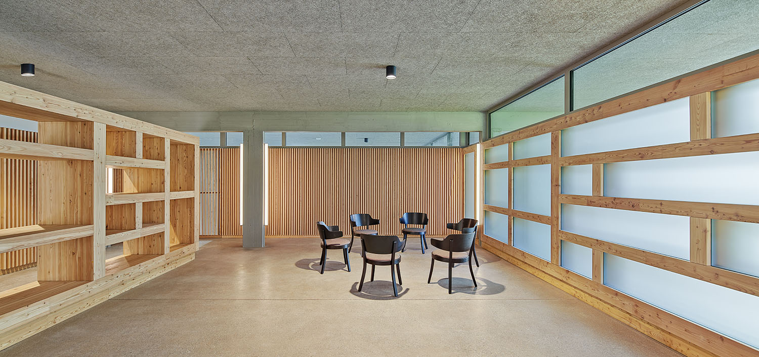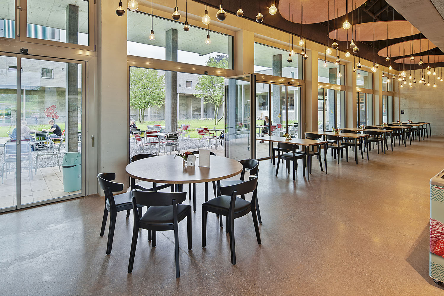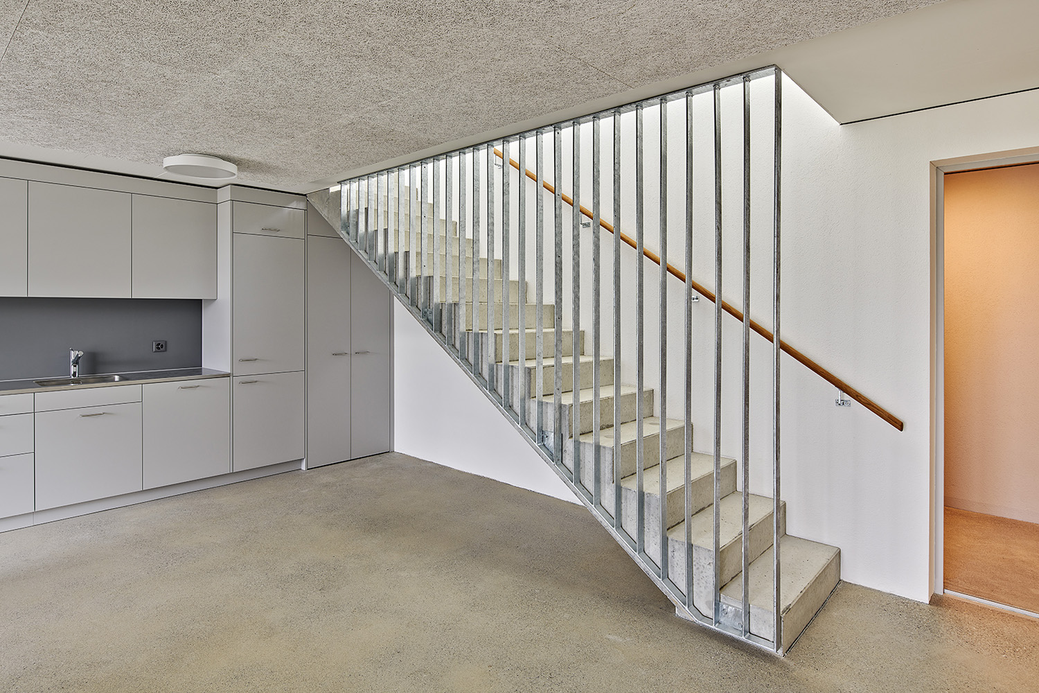 Im westlich gelegenen Wohnbereich weicht die ehemals gewerbliche Küche einer Wohnküche mit Kücheninsel. Sie bildet mit dem grosszügigen Essbereich und einer Feuerstelle das Herz der neuen Räumlichkeiten. Im östlichen Teil des Gebäudes entsteht der Rückzugsbereich mit Schlafzimmer. Um hier eine ausreichende Belichtung zu gewährleisten, werden sechs neue Holzfenster in die bestehende Stahlbetonwand eingesetzt.