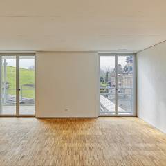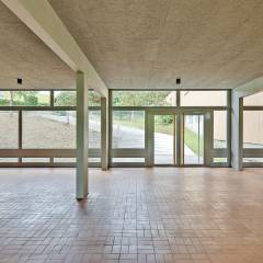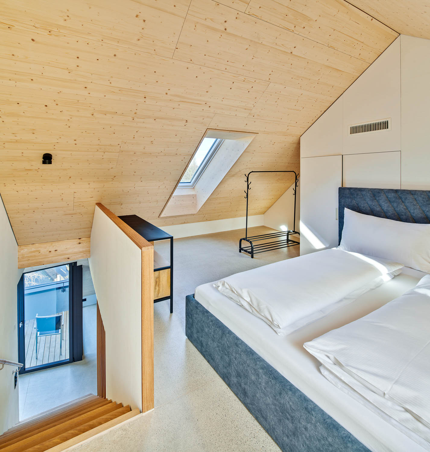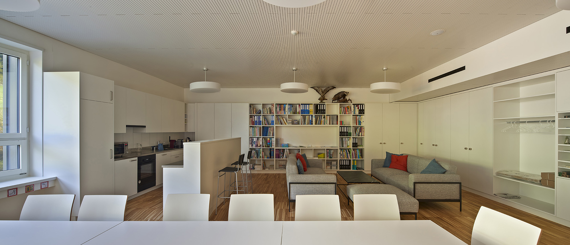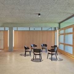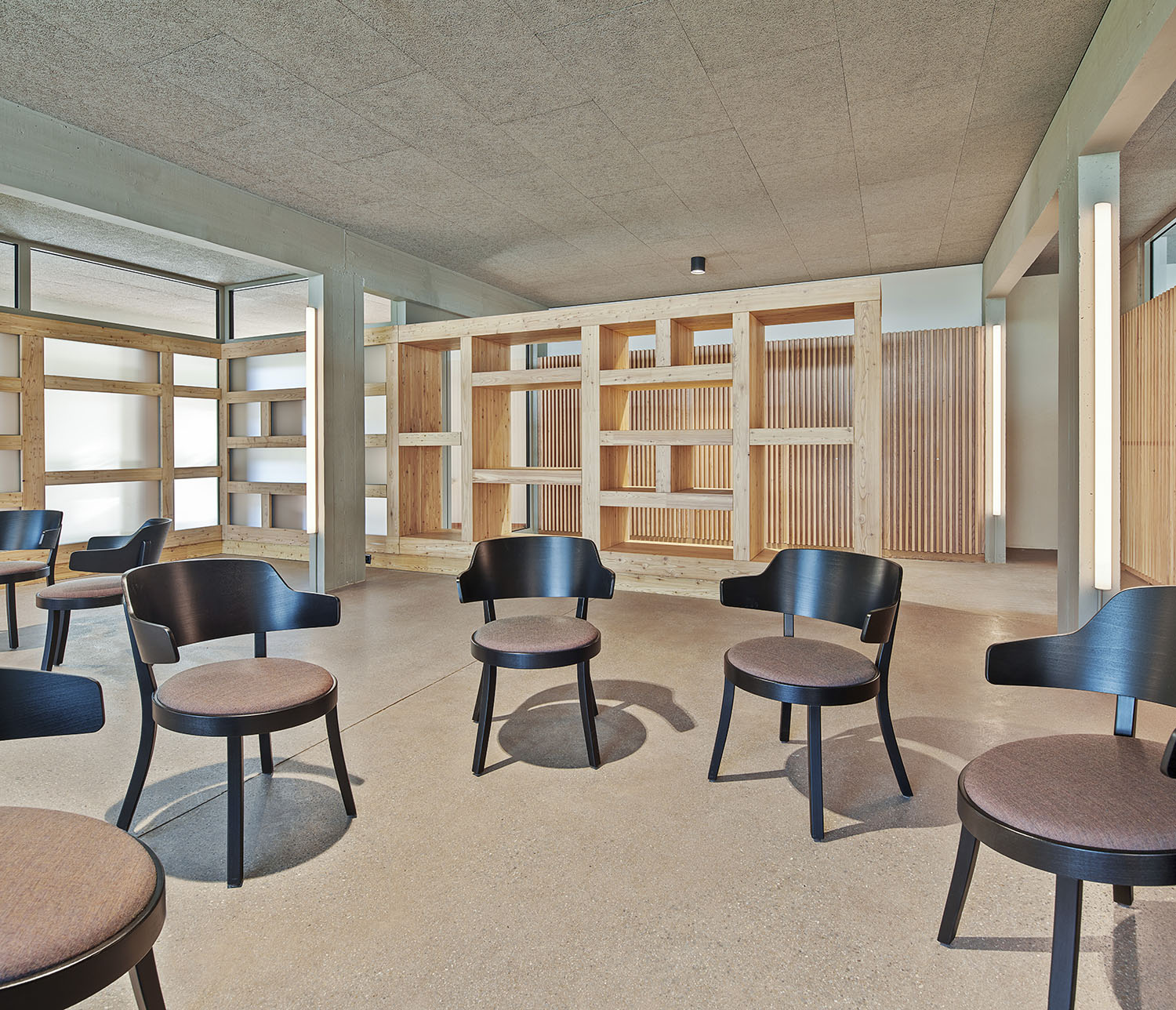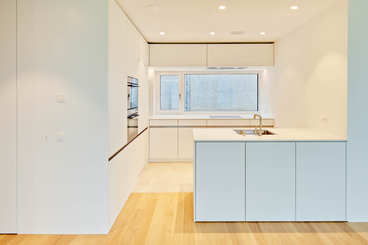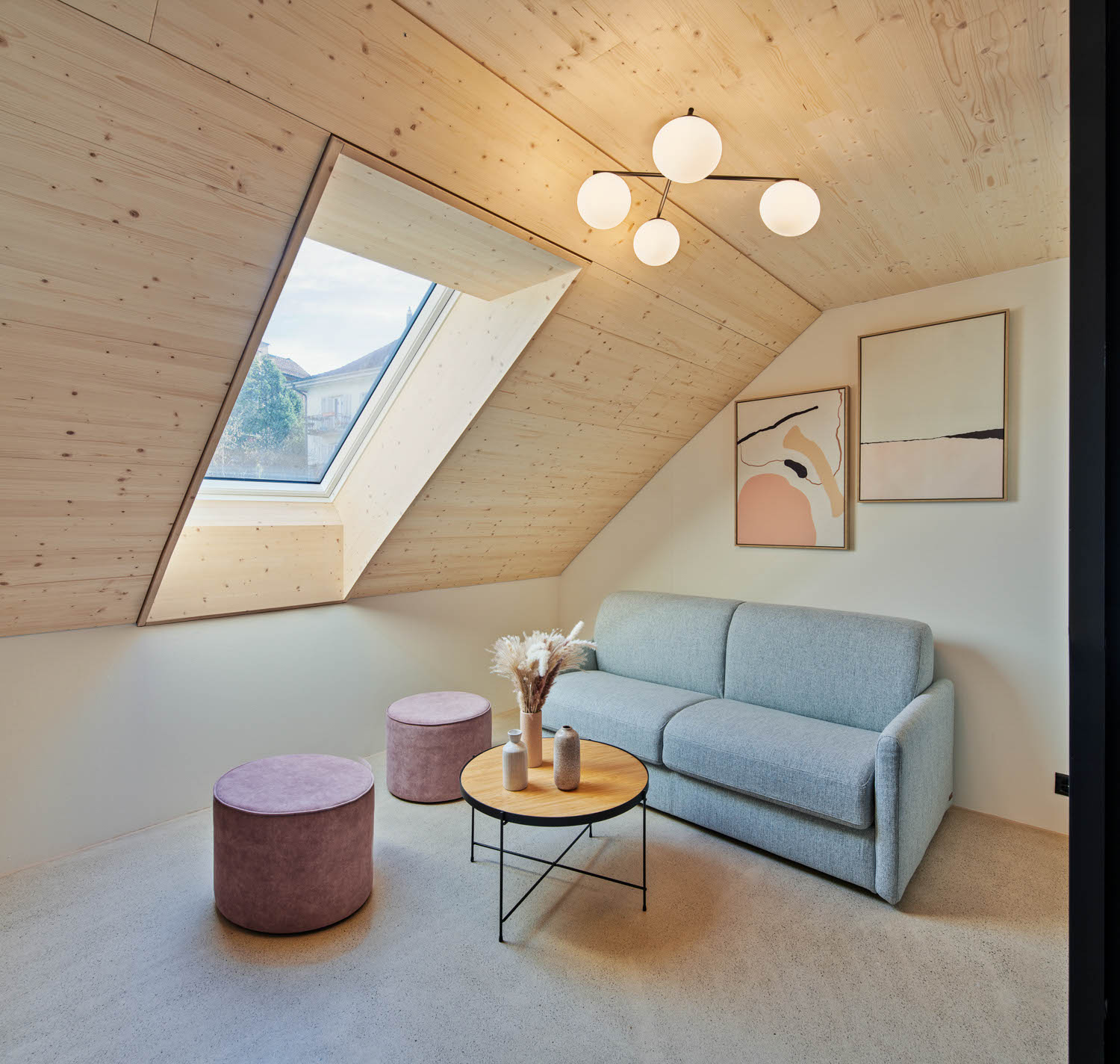 Im westlich gelegenen Wohnbereich weicht die ehemals gewerbliche Küche einer Wohnküche mit Kücheninsel. Sie bildet mit dem grosszügigen Essbereich und einer Feuerstelle das Herz der neuen Räumlichkeiten. Im östlichen Teil des Gebäudes entsteht der Rückzugsbereich mit Schlafzimmer. Um hier eine ausreichende Belichtung zu gewährleisten, werden sechs neue Holzfenster in die bestehende Stahlbetonwand eingesetzt.
