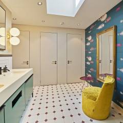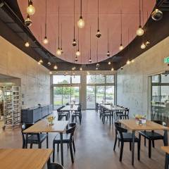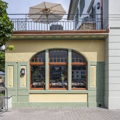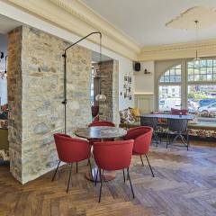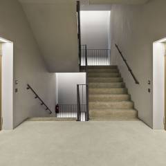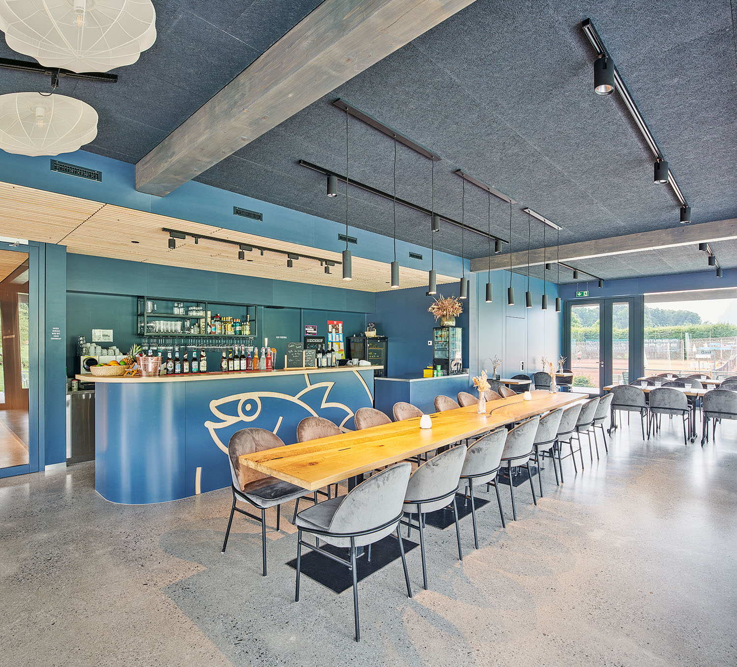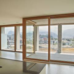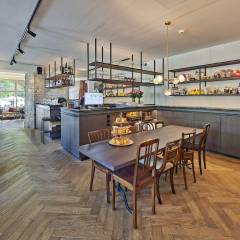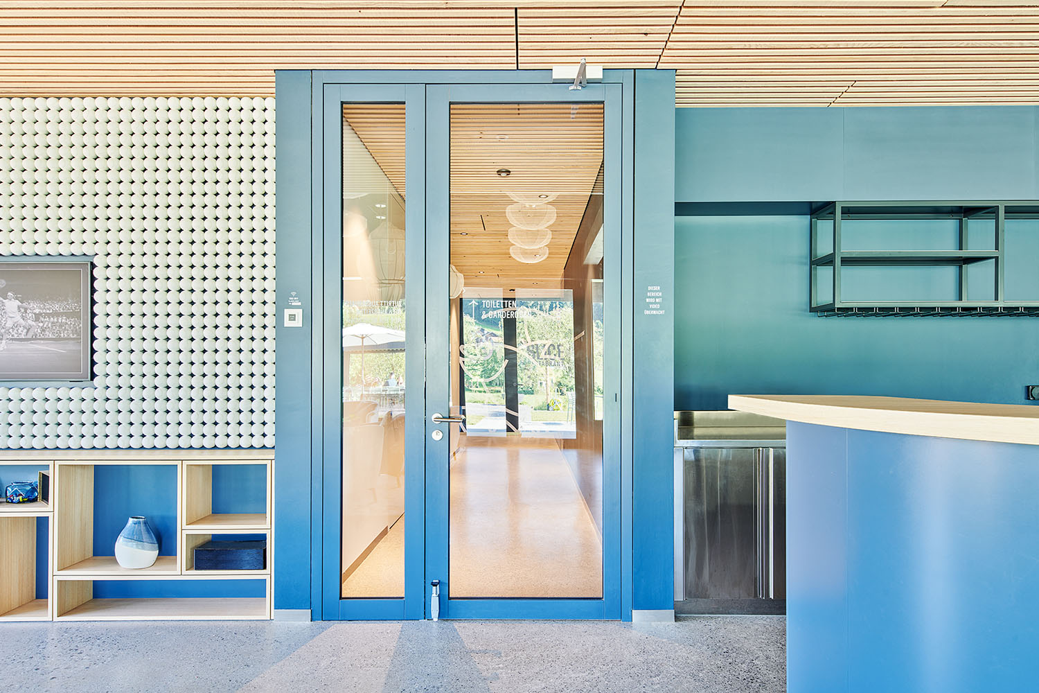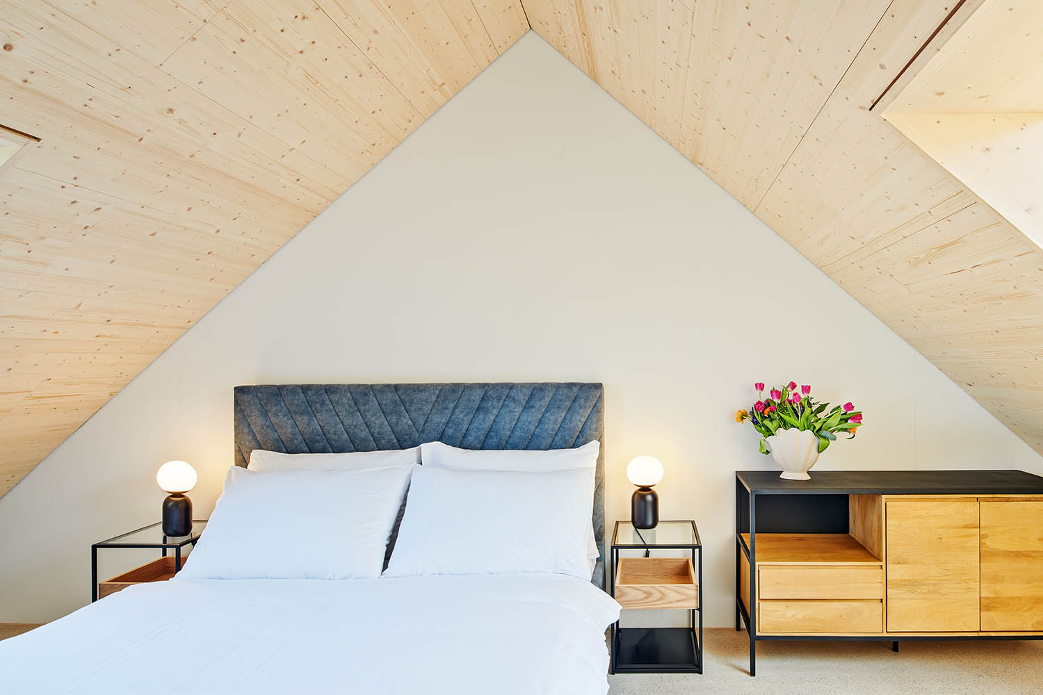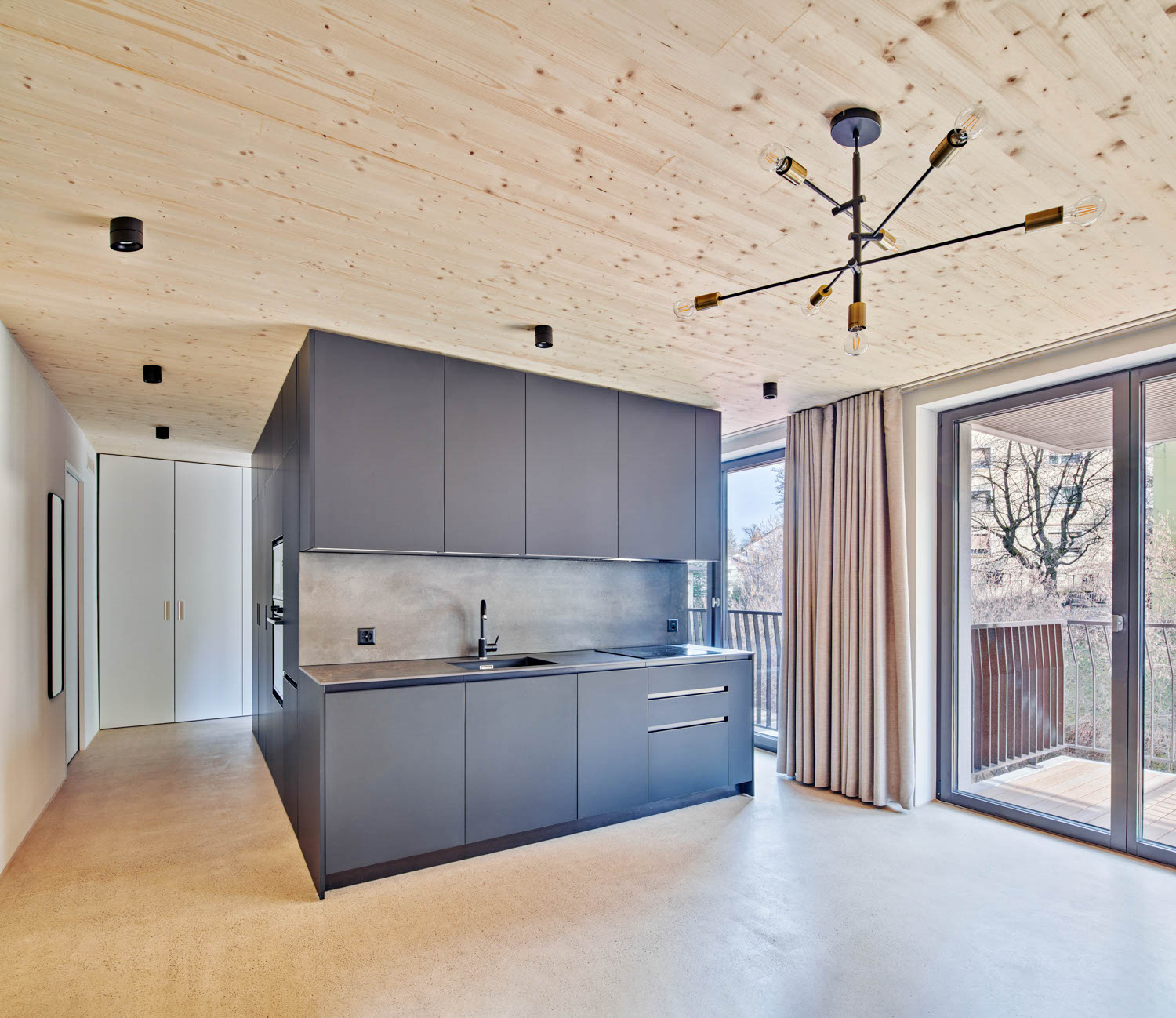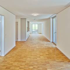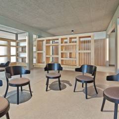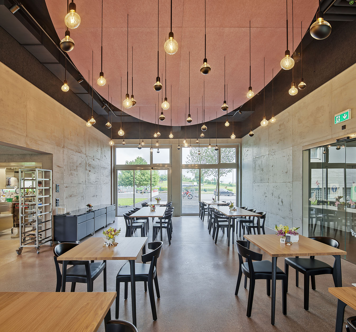 Im westlich gelegenen Wohnbereich weicht die ehemals gewerbliche Küche einer Wohnküche mit Kücheninsel. Sie bildet mit dem grosszügigen Essbereich und einer Feuerstelle das Herz der neuen Räumlichkeiten. Im östlichen Teil des Gebäudes entsteht der Rückzugsbereich mit Schlafzimmer. Um hier eine ausreichende Belichtung zu gewährleisten, werden sechs neue Holzfenster in die bestehende Stahlbetonwand eingesetzt.
