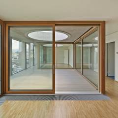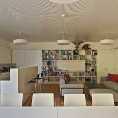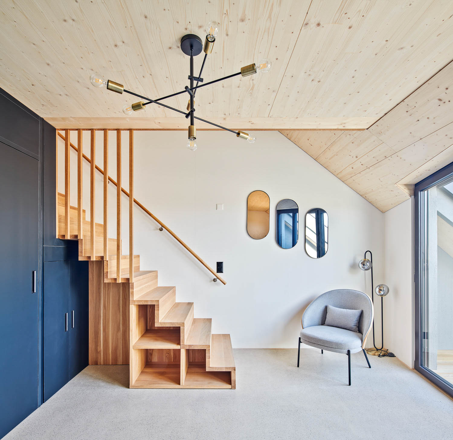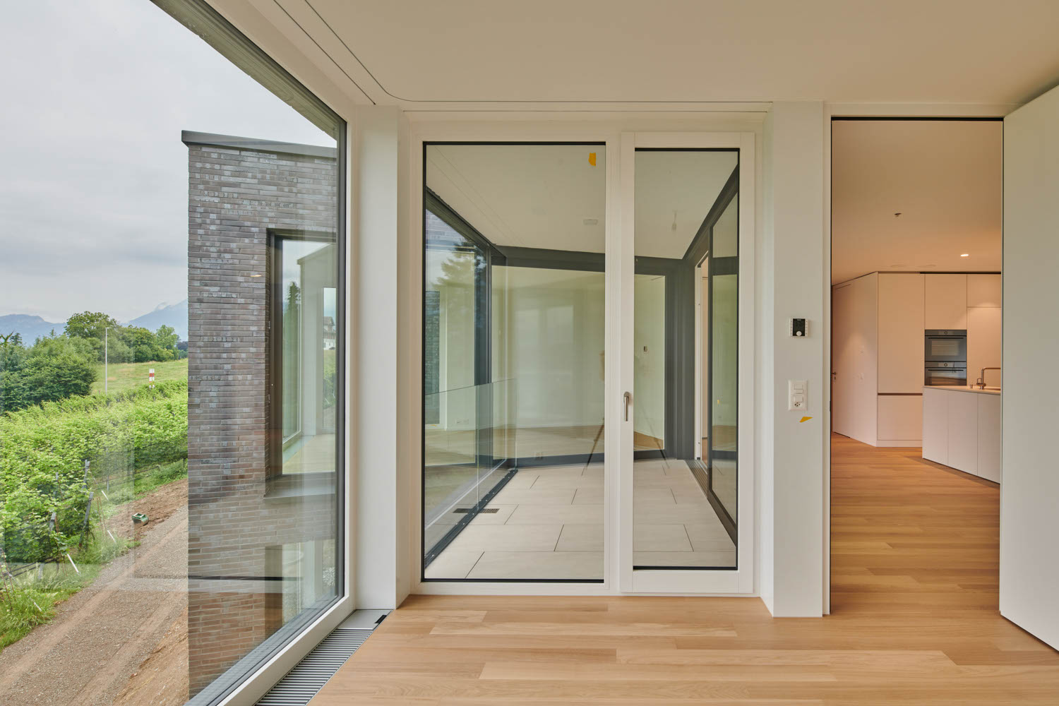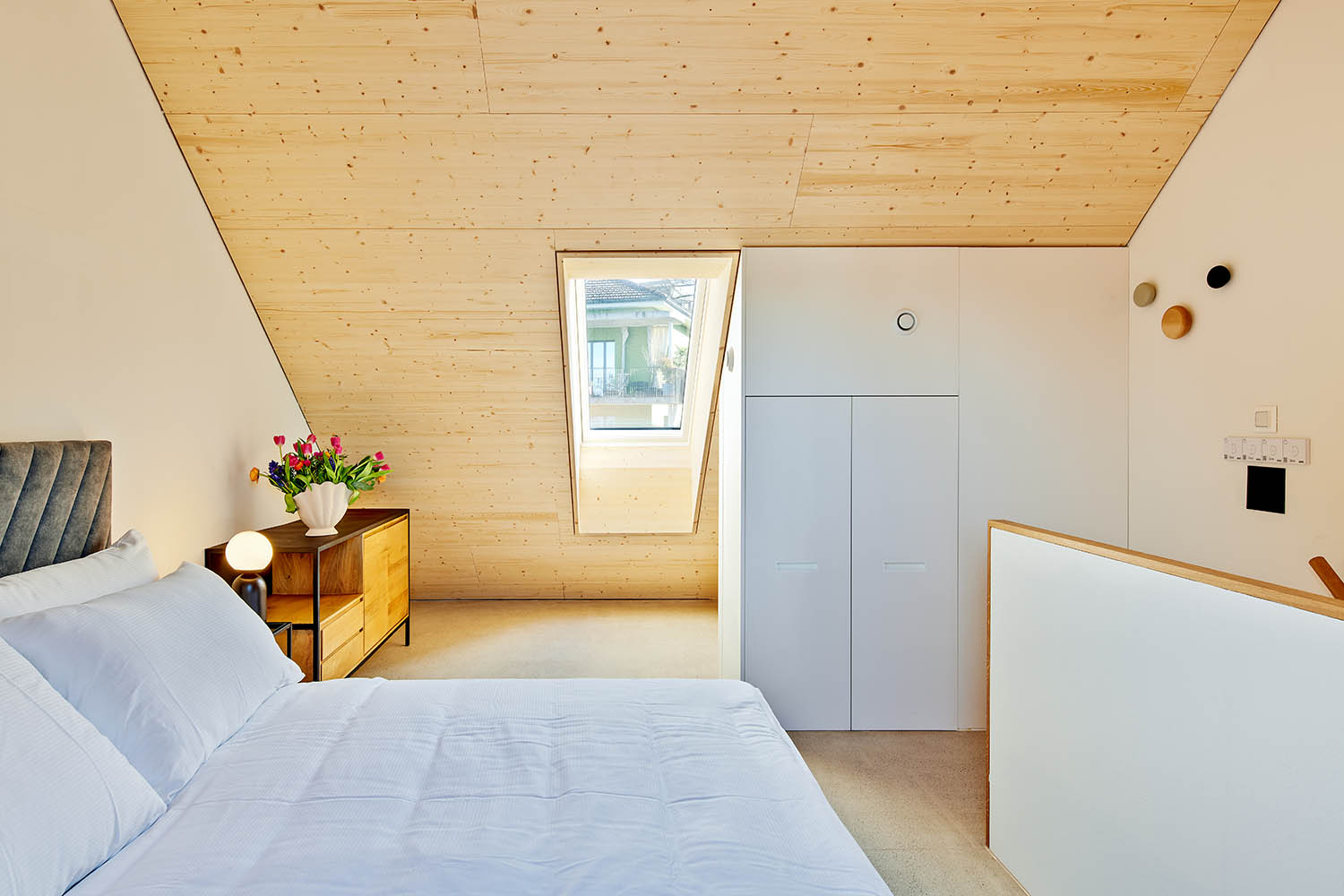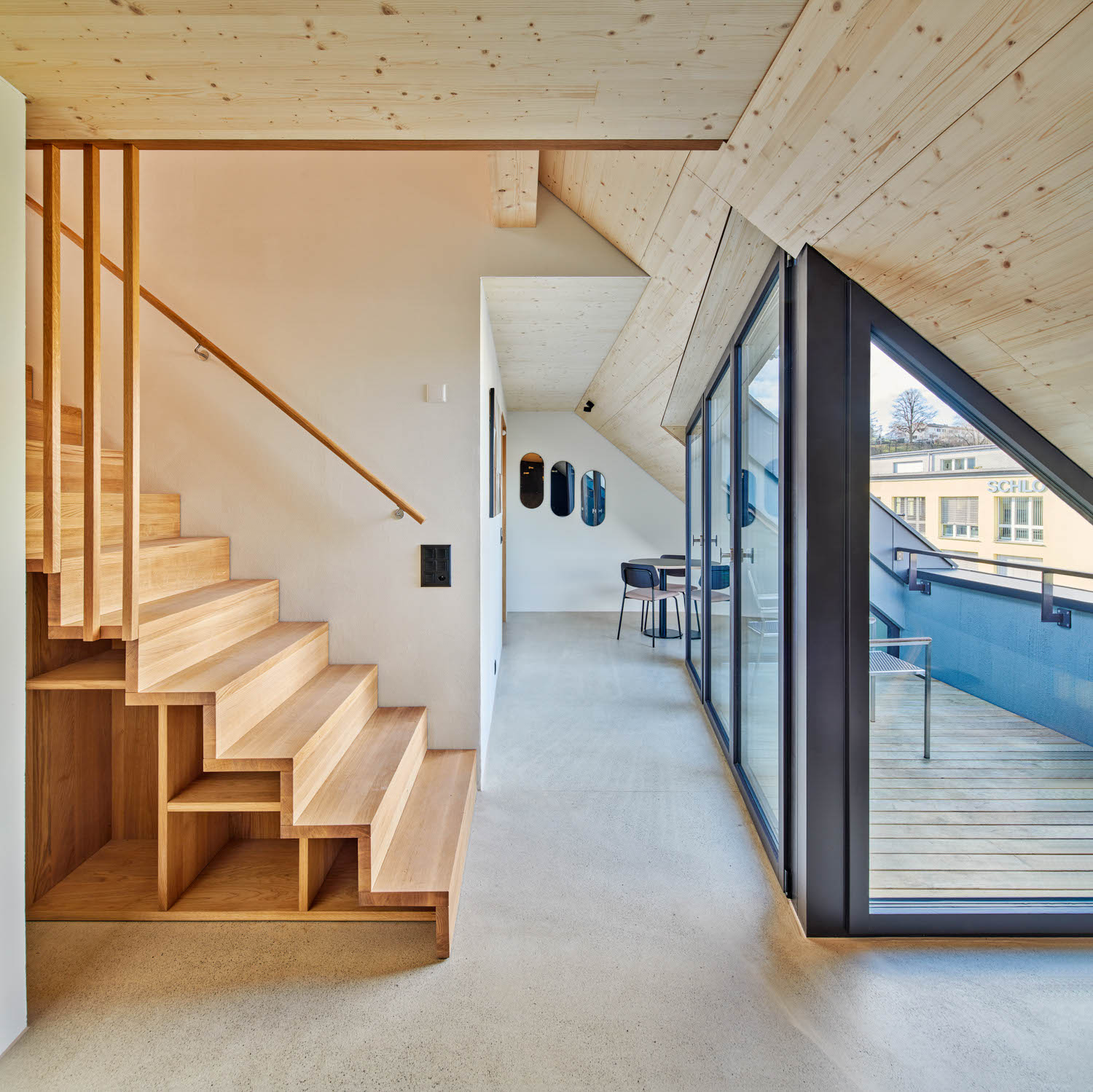In der zweiten Bautiefe befinden sich die Reihenhäuser. Ein Luftraum im Gebäude verbindet zwei Geschosse miteinander. Hier ist das Esszimmer platziert. Ein übergrosses Fenster bringt Licht ins Herz der Wohnung. Der Vorplatz im Obergeschoss wird so zum optimal belichteten Arbeitsplatz mit Weitsicht.