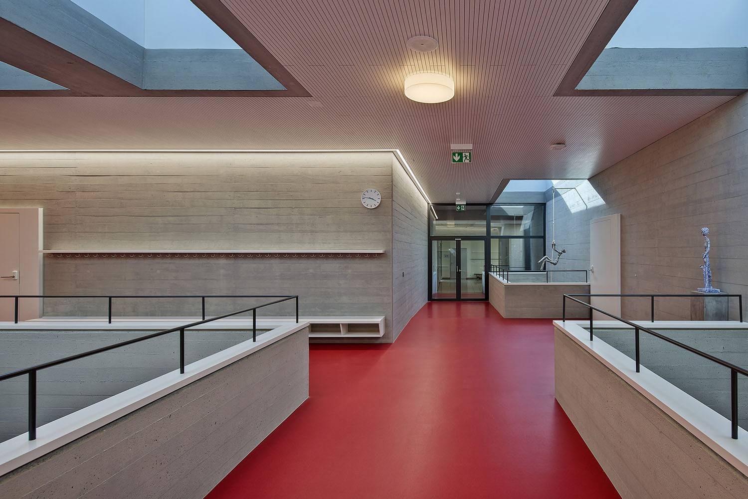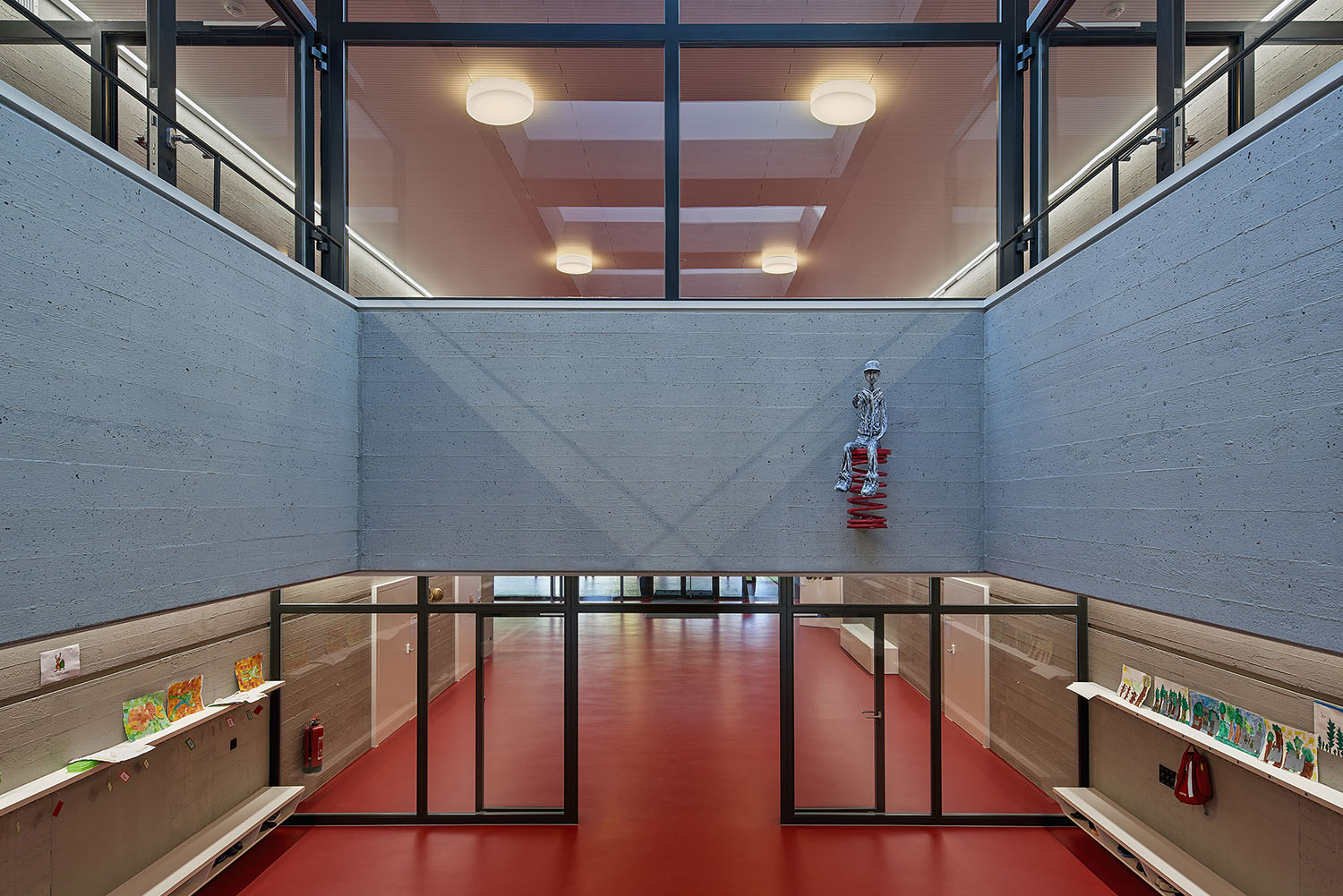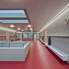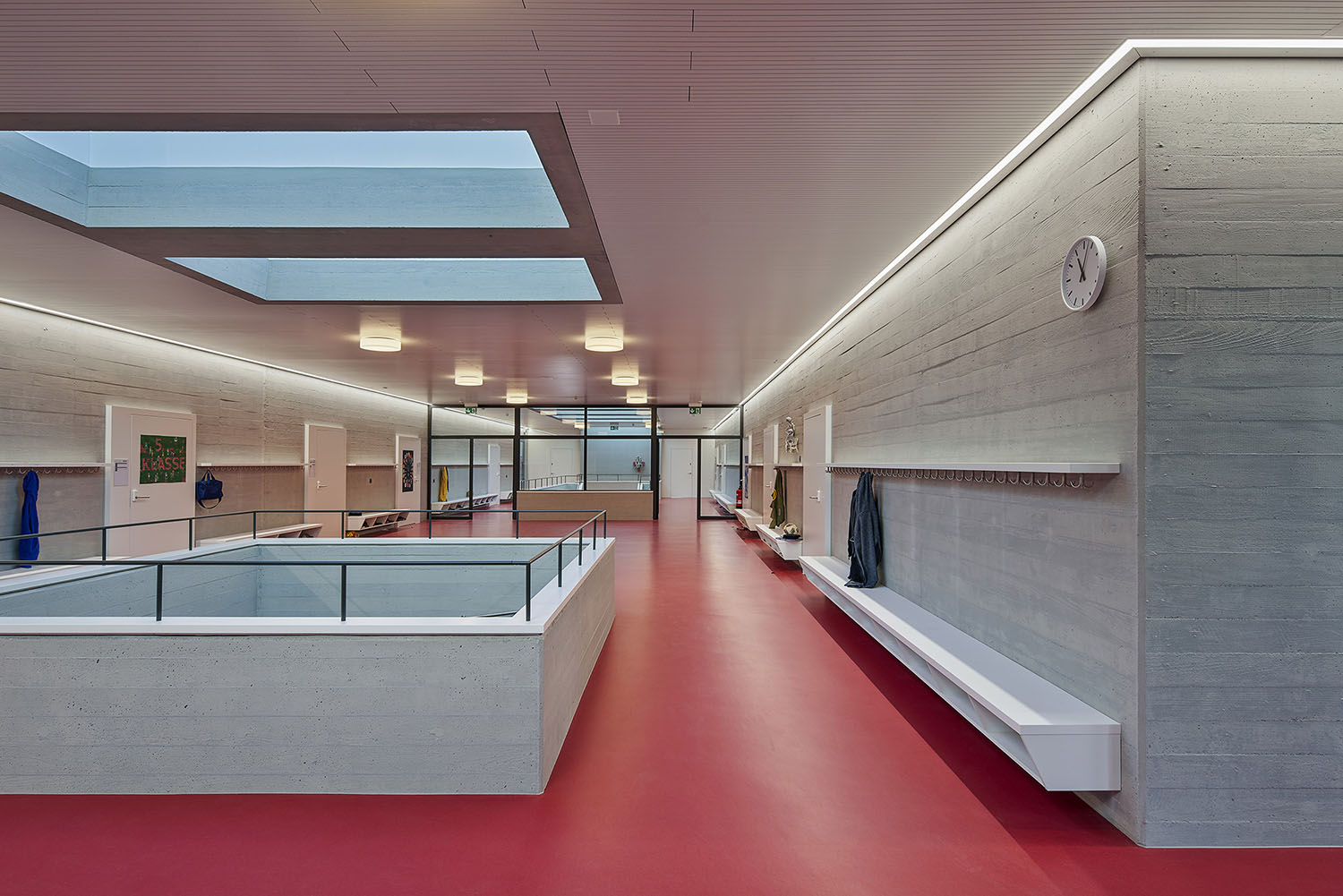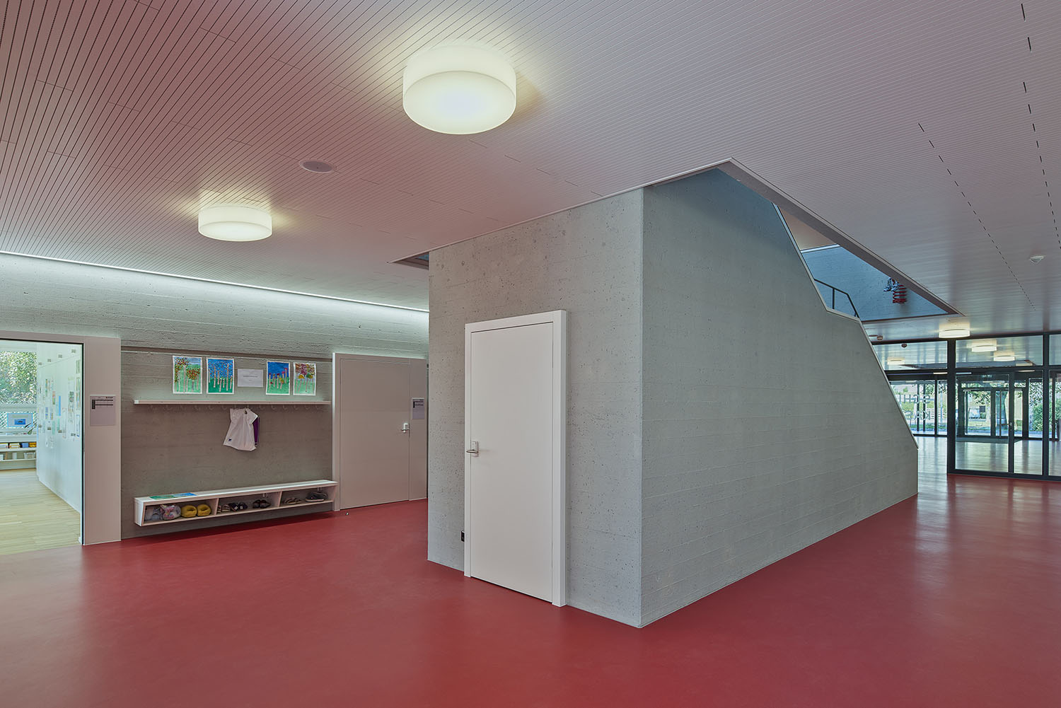 Der Neubau erweitert das bestehende Primarschulhaus gegen Norden und übernimmt dessen Primärstruktur, welche sich nach wie vor bestens für eine zeitgemässe Schule eignet. Die neue grosszügige Eingangshalle verbindet die beiden Trakte und schafft deutlichen Mehrwert. Sie ist Begegnungs- und Informationsraum der Schule und dient als Foyer für den Mehrzweckraum (Abendnutzung). Die erweiterte, von oben belichtete Mittelzone kann als zusätzlicher Unterrichtsraum für klassenübergreifende Arbeiten genutzt werden (Lernlandschaft) und erhält durch die Öffnung zum Erdgeschoss einen räumlichen Bezug zur Eingangshalle.