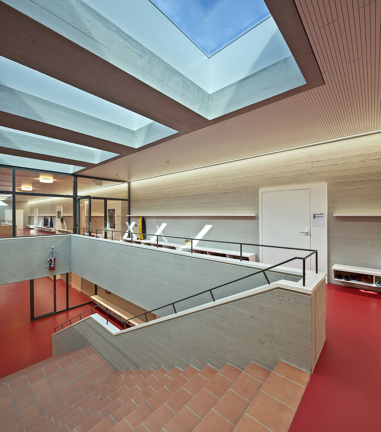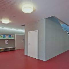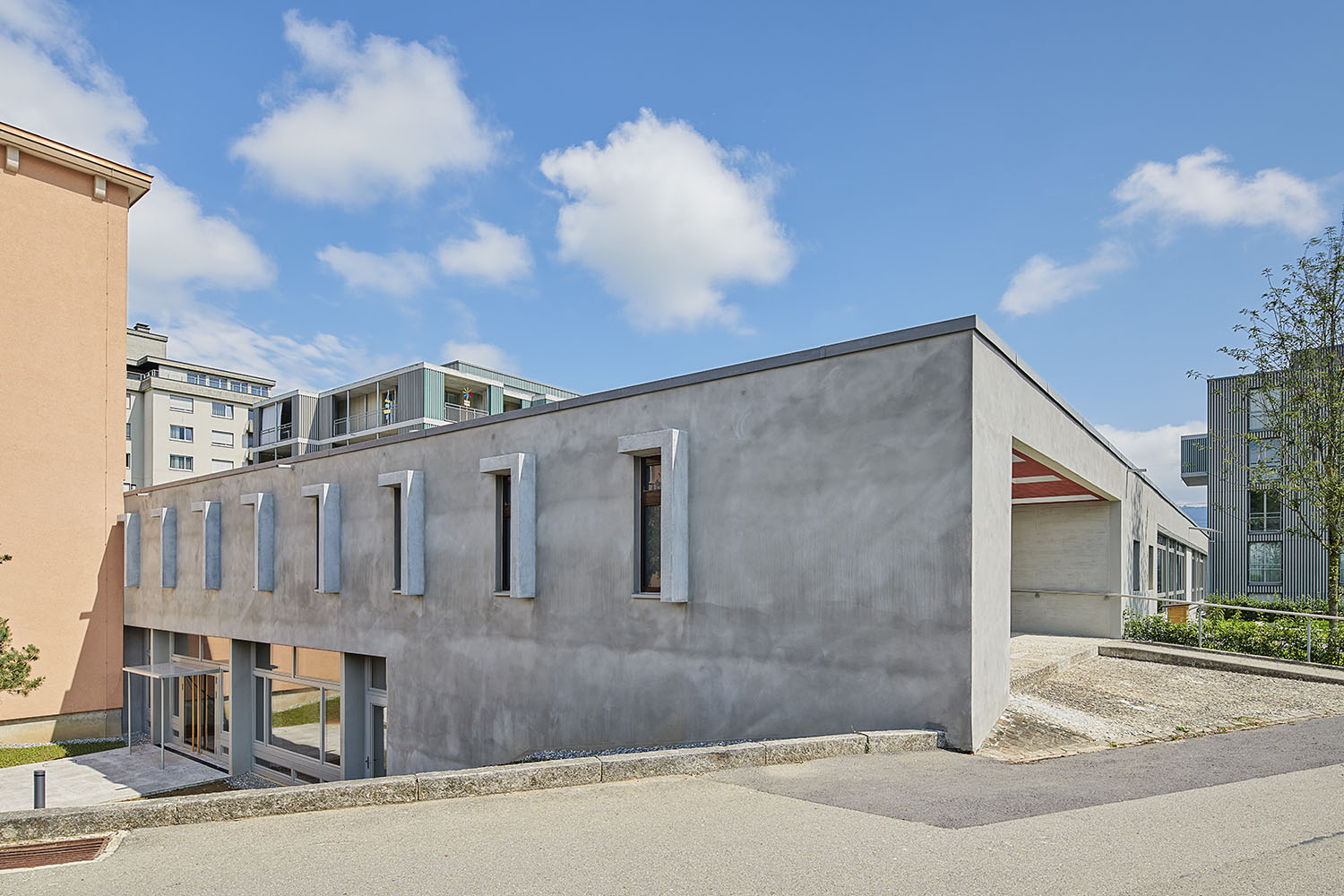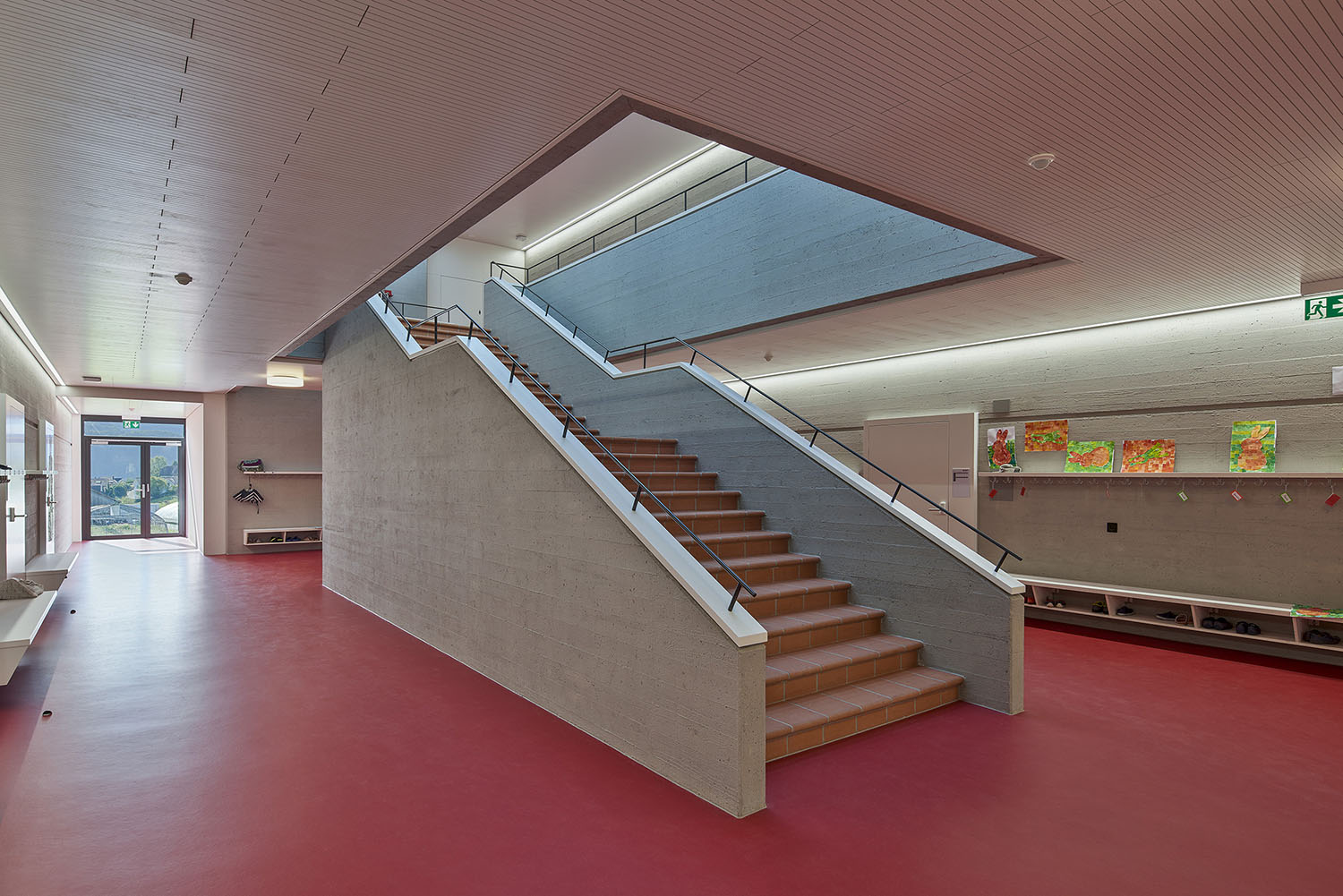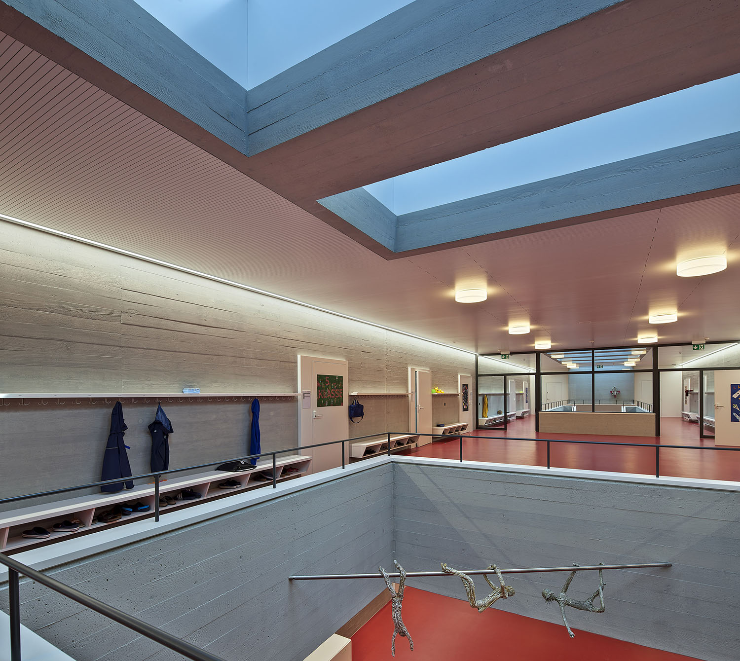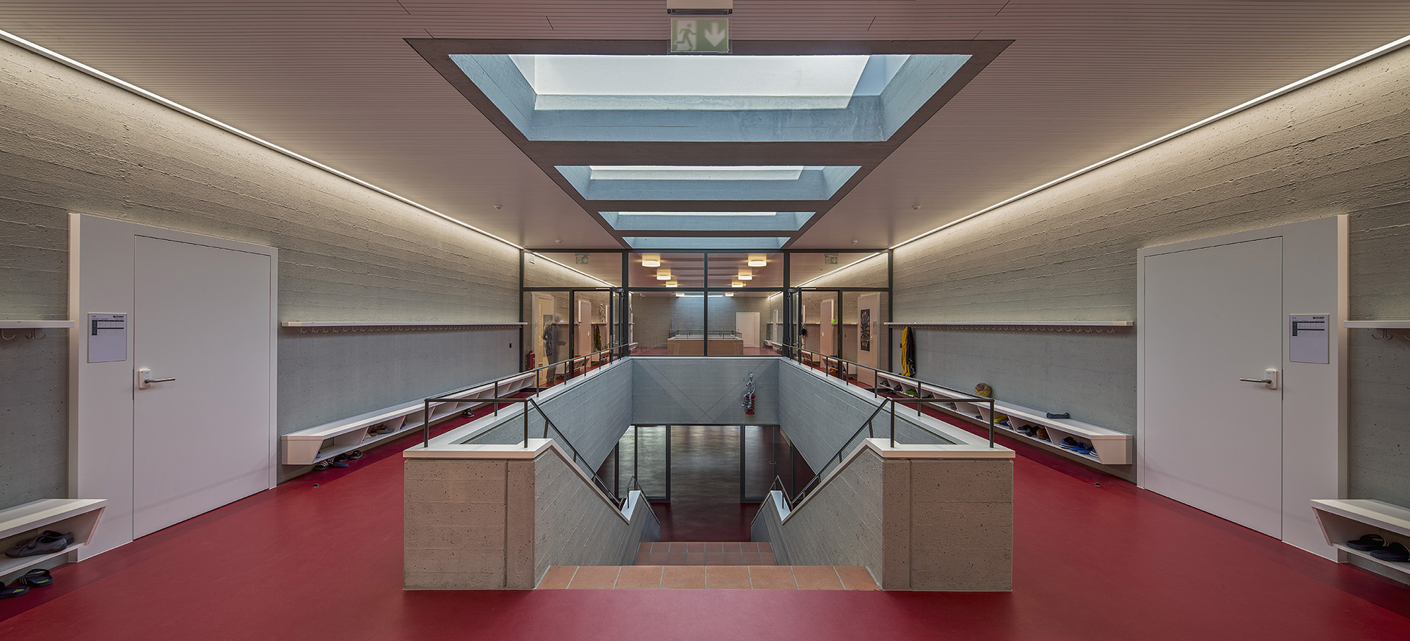 Der Neubau erweitert das bestehende Primarschulhaus gegen Norden und übernimmt dessen Primärstruktur, welche sich nach wie vor bestens für eine zeitgemässe Schule eignet. Die neue grosszügige Eingangshalle verbindet die beiden Trakte und schafft deutlichen Mehrwert. Sie ist Begegnungs- und Informationsraum der Schule und dient als Foyer für den Mehrzweckraum (Abendnutzung). Die erweiterte, von oben belichtete Mittelzone kann als zusätzlicher Unterrichtsraum für klassenübergreifende Arbeiten genutzt werden (Lernlandschaft) und erhält durch die Öffnung zum Erdgeschoss einen räumlichen Bezug zur Eingangshalle.