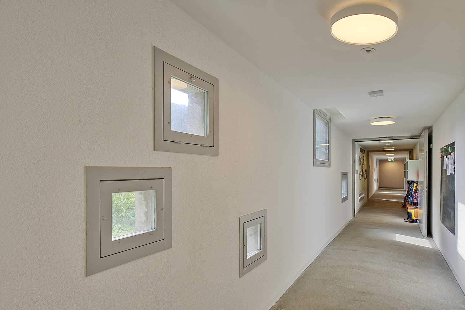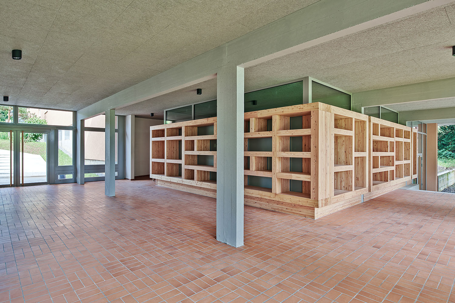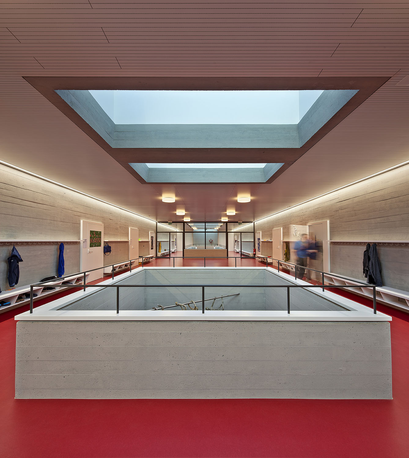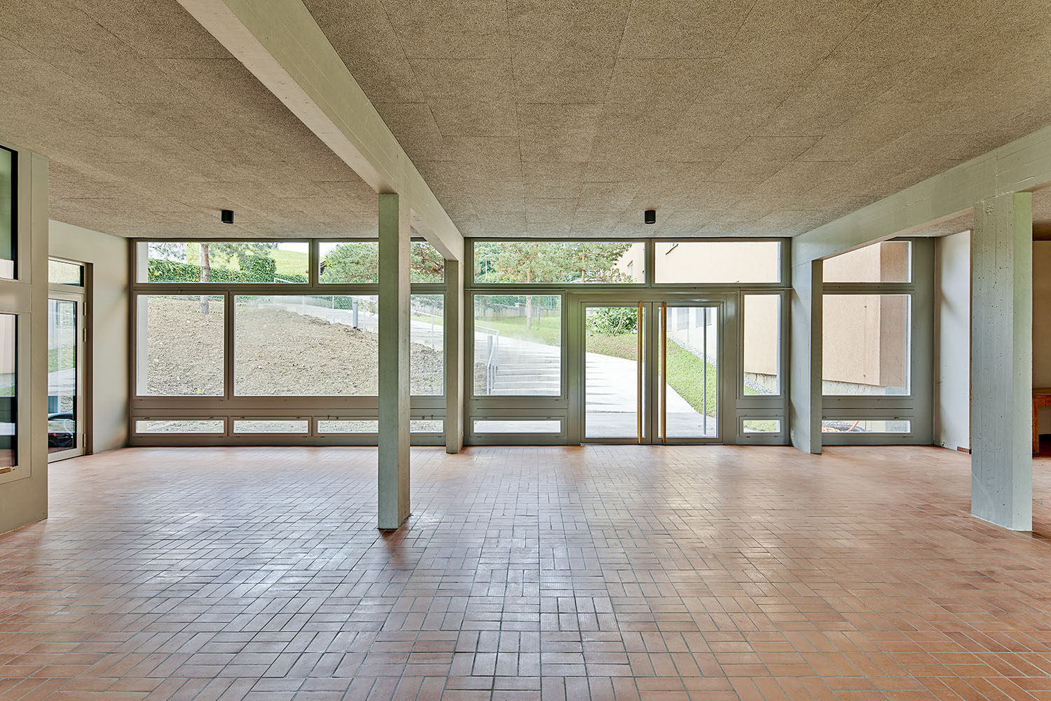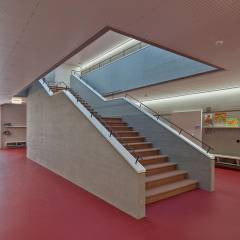 Der Neubau erweitert das bestehende Primarschulhaus gegen Norden und übernimmt dessen Primärstruktur, welche sich nach wie vor bestens für eine zeitgemässe Schule eignet. Die neue grosszügige Eingangshalle verbindet die beiden Trakte und schafft deutlichen Mehrwert. Sie ist Begegnungs- und Informationsraum der Schule und dient als Foyer für den Mehrzweckraum (Abendnutzung). Die erweiterte, von oben belichtete Mittelzone kann als zusätzlicher Unterrichtsraum für klassenübergreifende Arbeiten genutzt werden (Lernlandschaft) und erhält durch die Öffnung zum Erdgeschoss einen räumlichen Bezug zur Eingangshalle.