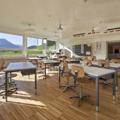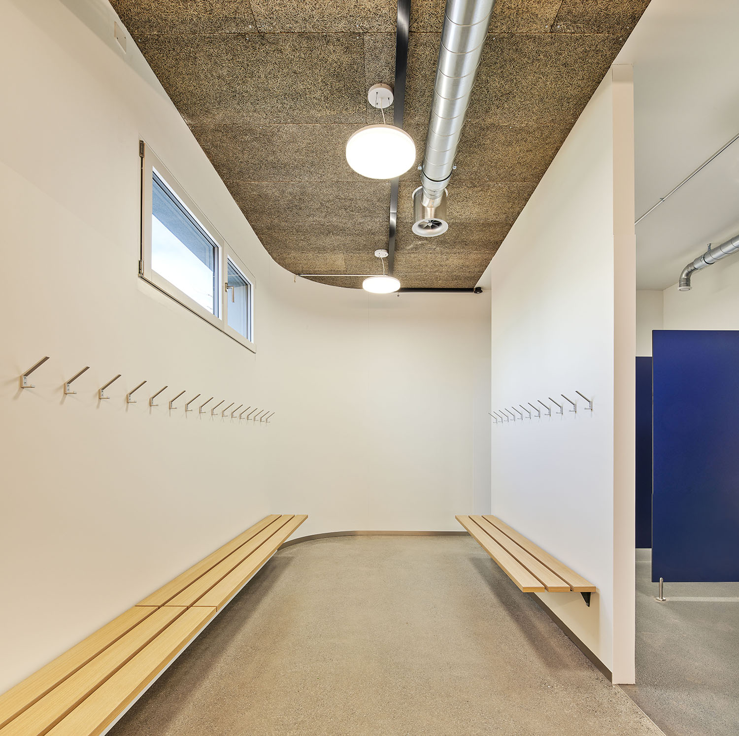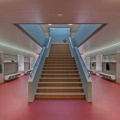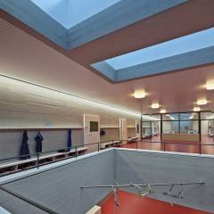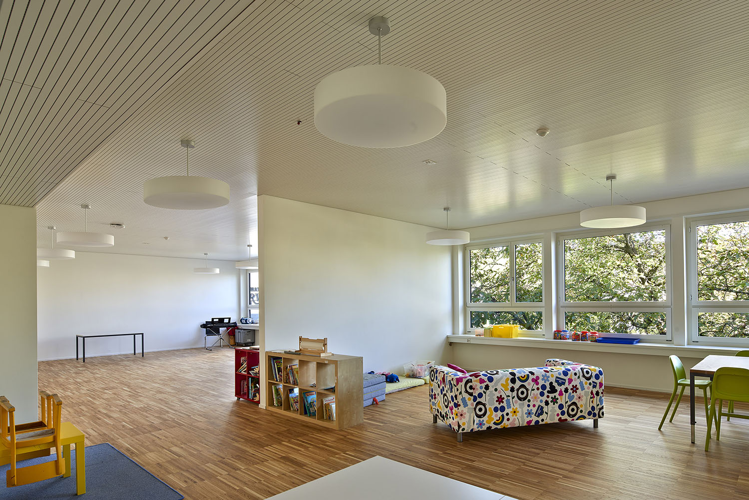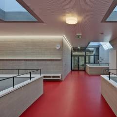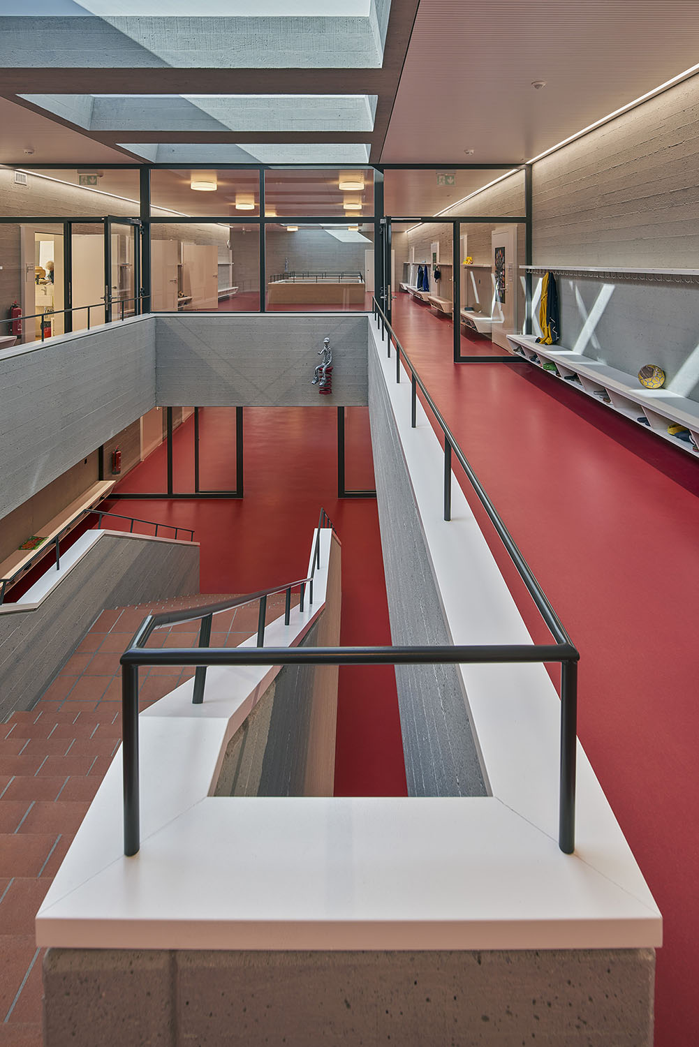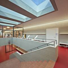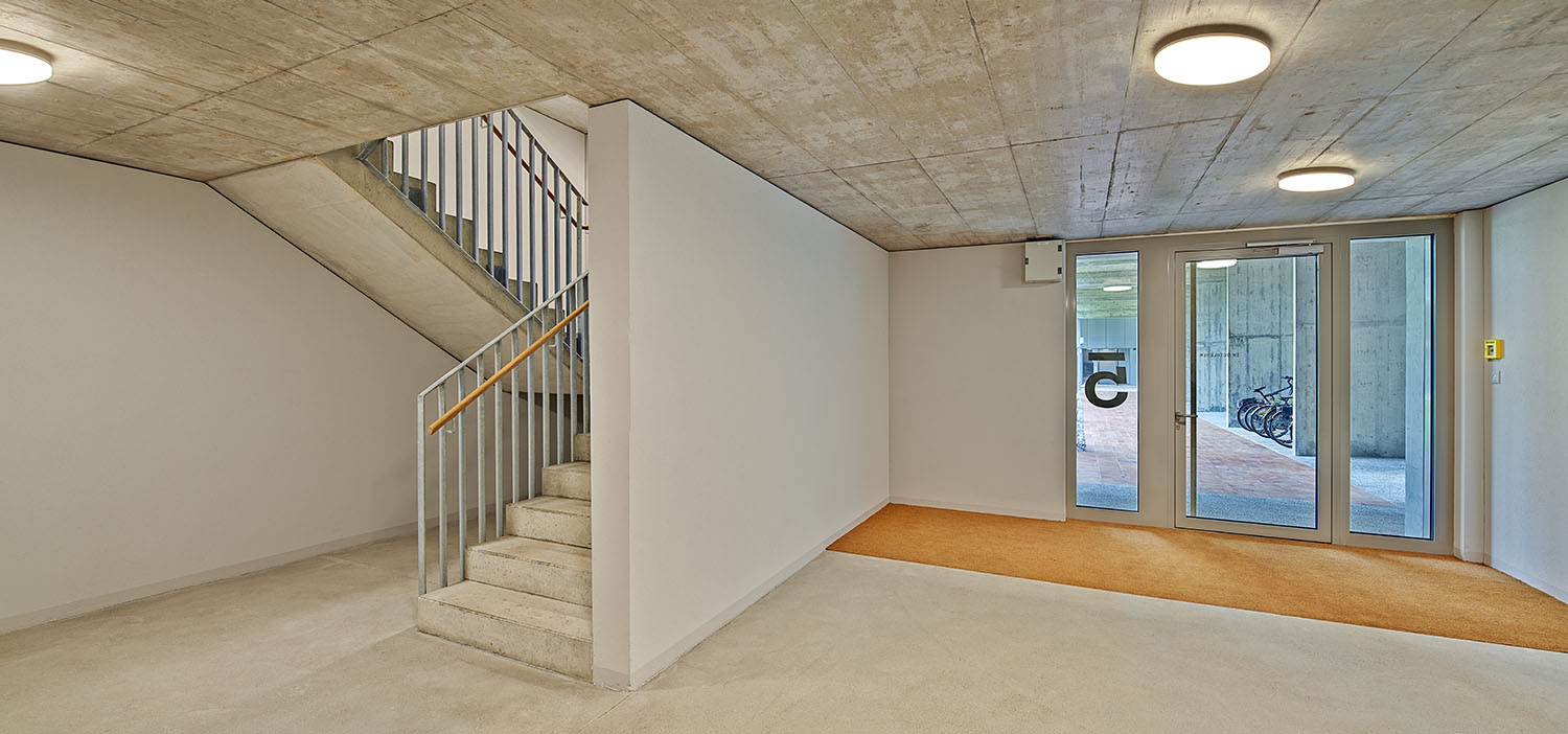 Der Neubau erweitert das bestehende Primarschulhaus gegen Norden und übernimmt dessen Primärstruktur, welche sich nach wie vor bestens für eine zeitgemässe Schule eignet. Die neue grosszügige Eingangshalle verbindet die beiden Trakte und schafft deutlichen Mehrwert. Sie ist Begegnungs- und Informationsraum der Schule und dient als Foyer für den Mehrzweckraum (Abendnutzung). Die erweiterte, von oben belichtete Mittelzone kann als zusätzlicher Unterrichtsraum für klassenübergreifende Arbeiten genutzt werden (Lernlandschaft) und erhält durch die Öffnung zum Erdgeschoss einen räumlichen Bezug zur Eingangshalle.