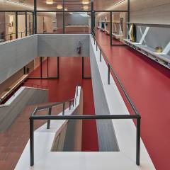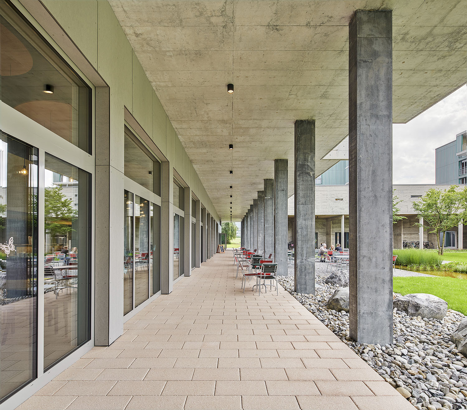 Dieses ausdrucksstarke Gebäude ist Teil des Vermächtnisses von Viscosuisse und prägt den Charakter des Ortes. Die weit gespannte Struktur aus Säulen, Deckenbalken und vorgefertigten Rippenbetondecken schafft grosszügige, durchgehende Räume. Das offene Erdgeschoss stärkt die Anbindung der Hochschule an den Park entlang des Flusses. Es ist eine Zone, in der sich die Öffentlichkeit und die Hochschule treffen.