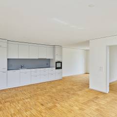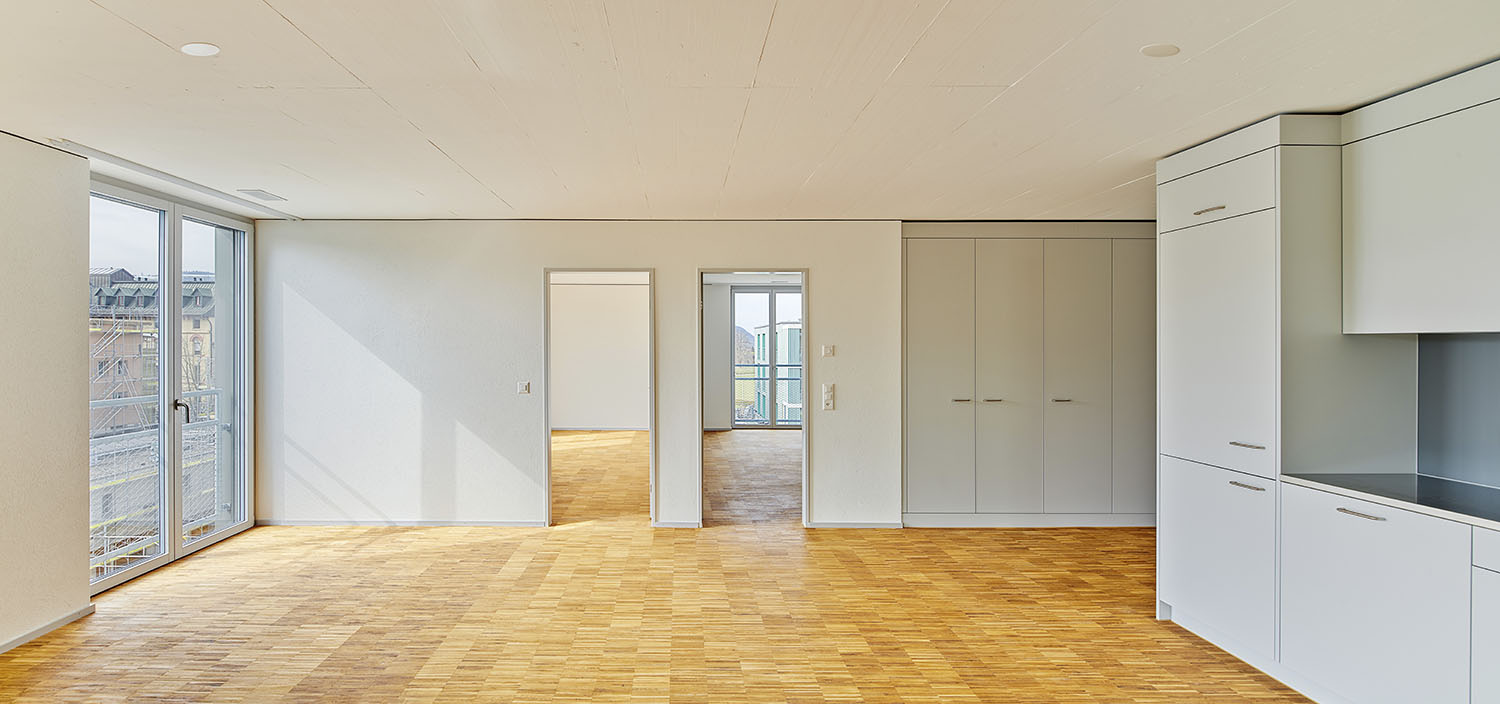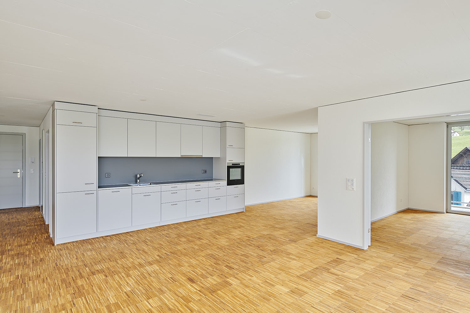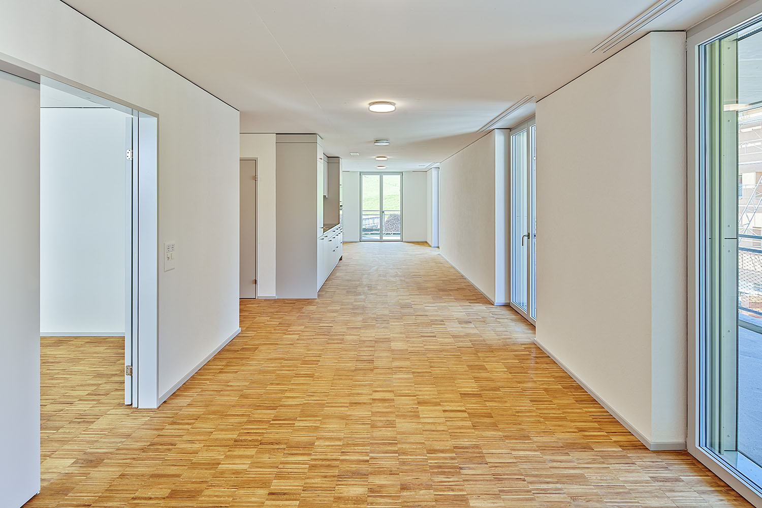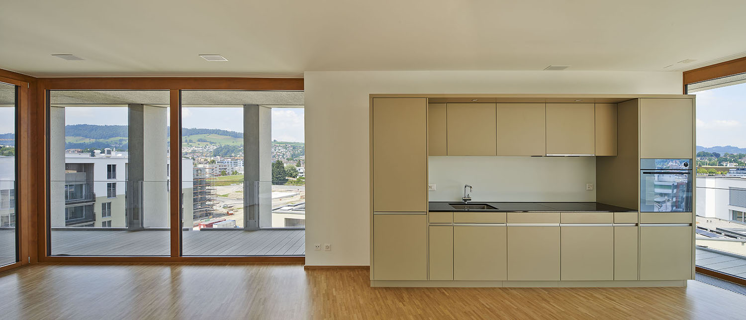 Das Haupthaus bildet den Auftakt zum neuen Quartier. Es liegt an der vielbefahrenen Rosengartenstrasse. Die Schlaf- und Wohnräume orientieren sich weg von der Strasse. Die Wohnküchen liegen an der Strassenfassade mit grosszügiger Panoramasicht in die Voralpen. Der Wohn-Essbereich erstreckt sich über die gesamte Gebäudetiefe.