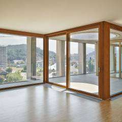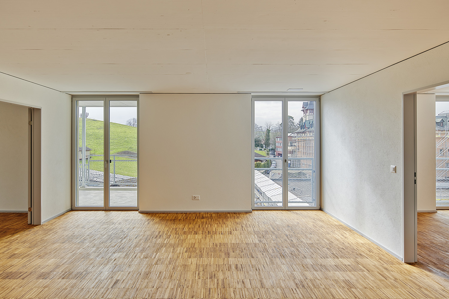 Ein Hingucker ist das neue Mehrfamilienhaus am Schlossberg in Luzern: die markante Holzschindelfassade verweist auf die Bausubstanz aus Holz. Das Gebäude wird durch den mittigen Kern und die Brandmauern getragen, die Strassen- und Hoffassaden sind als flexible Skelettstrukturen ausgeführt.