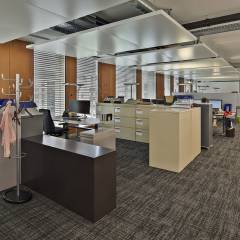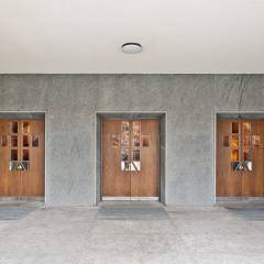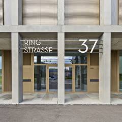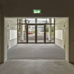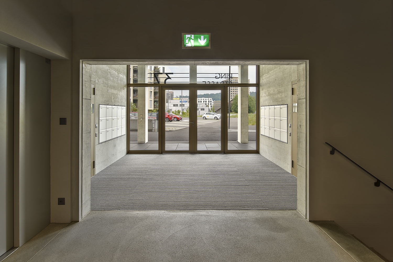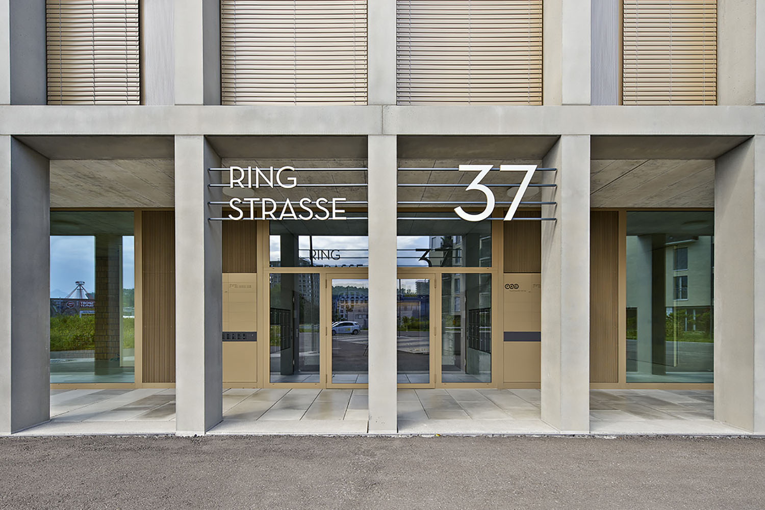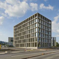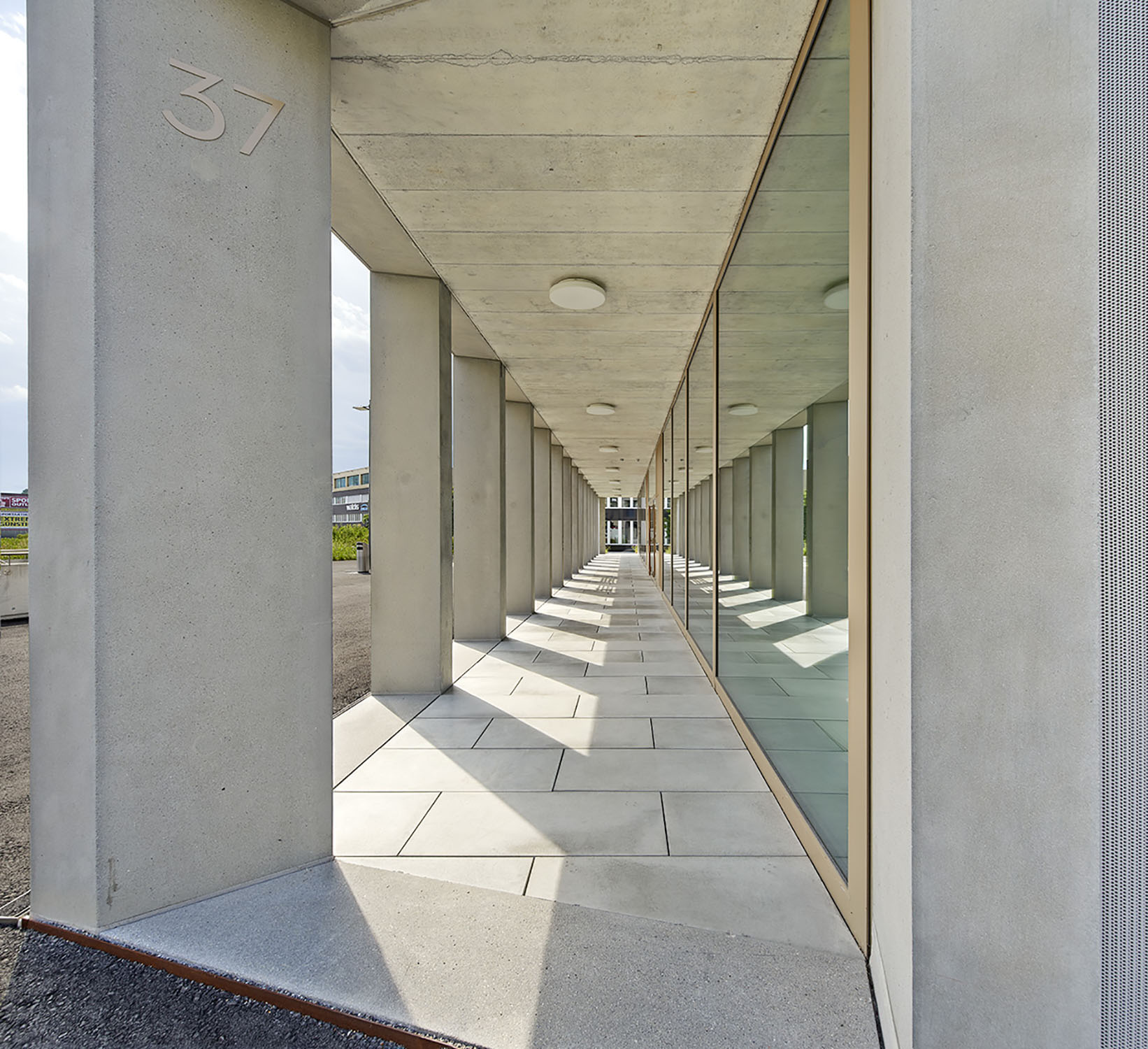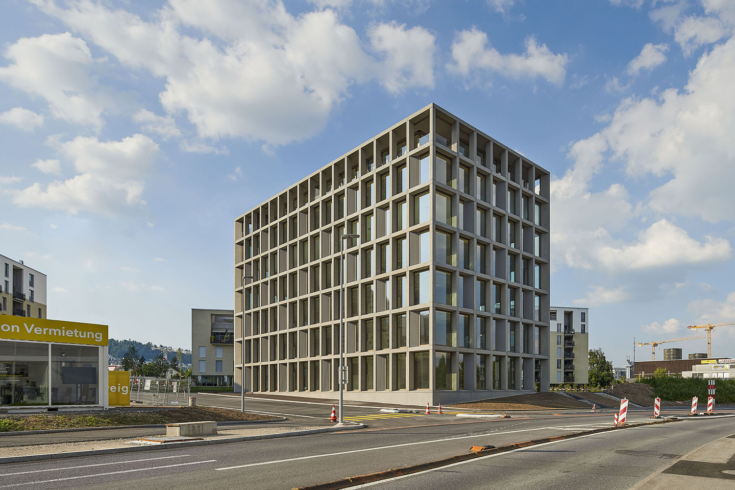 Eine präzise, feine Rasterstruktur bestehend aus tragenden Beton-Elementen umspannt den siebengeschossigen Quader des Bürogebäudes, und verleiht dem Gebäude am Eingang in den Schweighofpark eine angemessene Identität und Präsenz. Der Zugang befindet sich in der öffentlichen Arkade, die den Fussgänger von der Ringstrasse ins Innere des Areals führt.