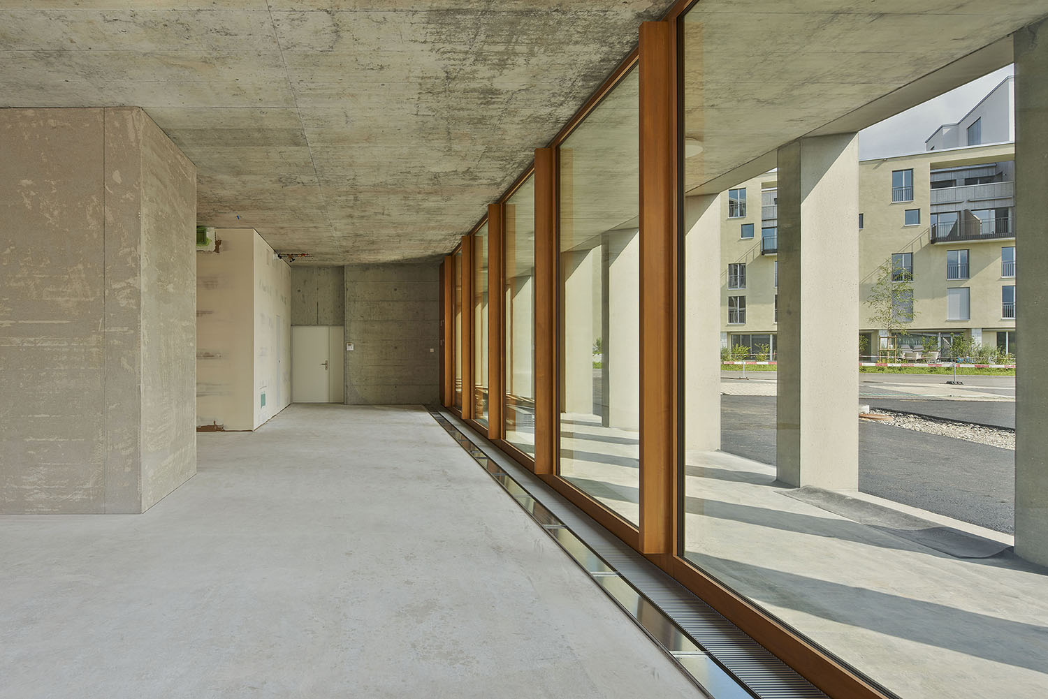 Der Zentrumsbau hat eine Stahlbetonskelettbauweise. Das Erdgeschoss ist teilweise freigespielt, so dass eine klare Sichtverbindung zwischen dem Platz und dem östlichem Gebietsteil entsteht. Die Aussenhaut wird bis ins Attikageschoss in Holz ausgeführt. Die unterschiedlichen Nutzungen auf den Geschossen zeichnen sich mit den eingebauten Loggien auf der Fassade ab.